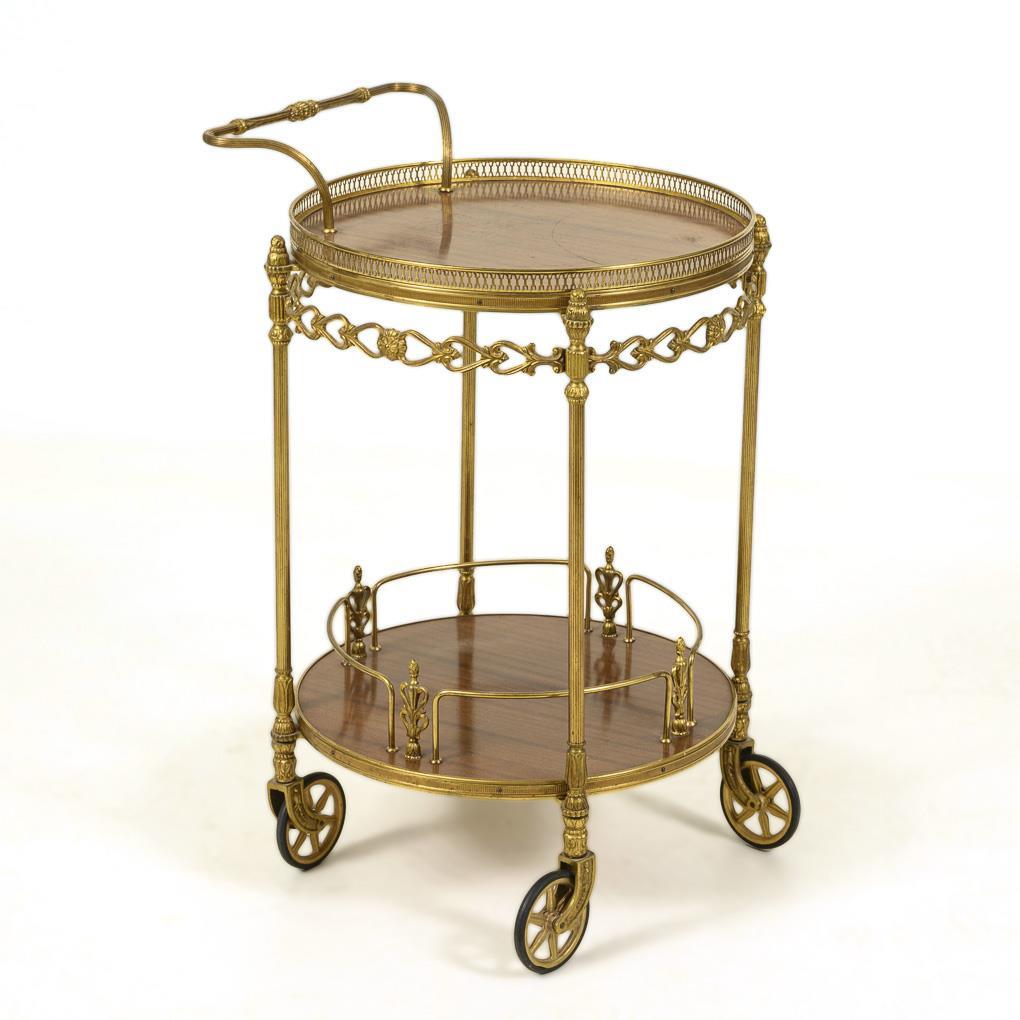 Wheeled tea trolley (so-called Desserte) made of fluted brass frame with 2 wooden shelves, lower shelf with brass frame. Metal with traces of corrosion, signs of age / use.
