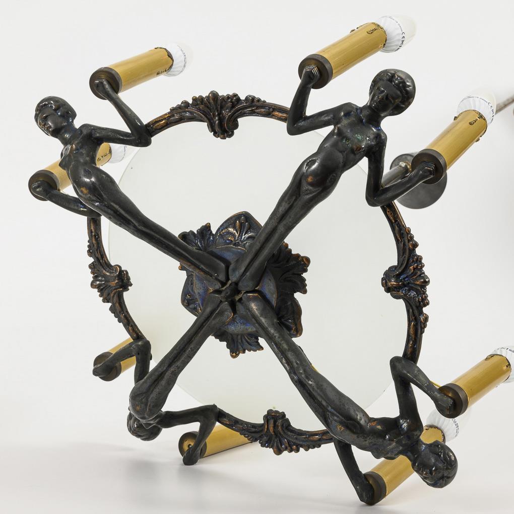 8-flame ceiling lamp on blackened central strut with tulip canopy (on it further metal strut) and 4 arms in the form of a fully plastic female human figure, each holding 1 candle spout in her hands, accented with satin glass plate. Metal with traces of corrosion.