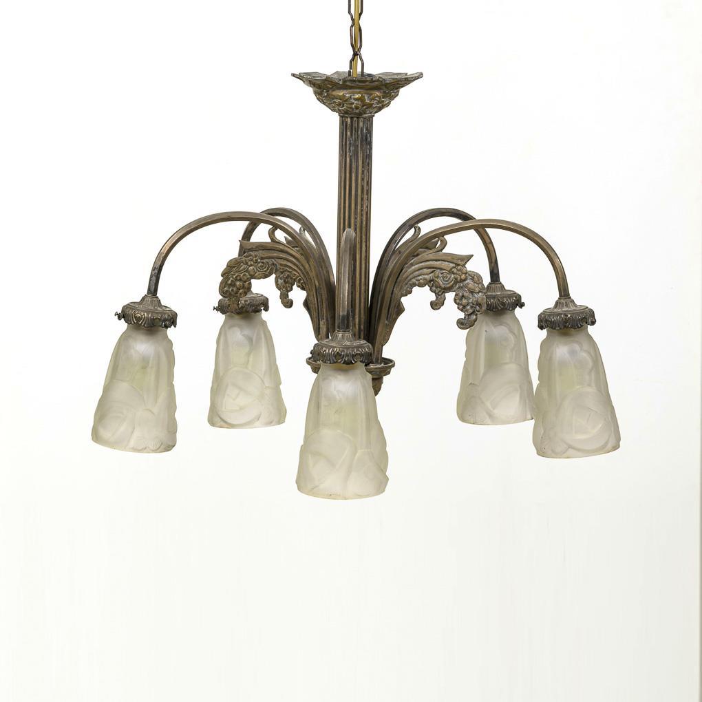 5-flame hanging lamp on fluted central shaft with rosette canopy and 5 curved arms with tulip shades, accented with stylized cornucopias. Metal with traces of corrosion, glass edges with minimal chips, slight signs of age/use.