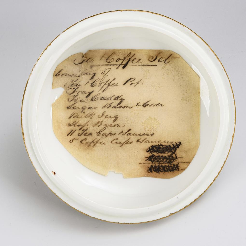 Sugar bowl with flower knob lid. In rocaillerelief cartouches finely painted landscapes with birds. In the lid old sticky note. Inside burn mark on the bottom, flower knob minimally bumped, small glaze chipping on the leaf of the knob flower.