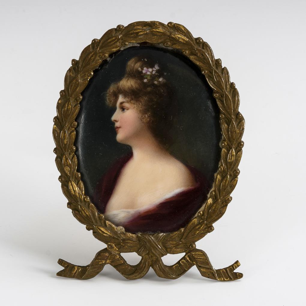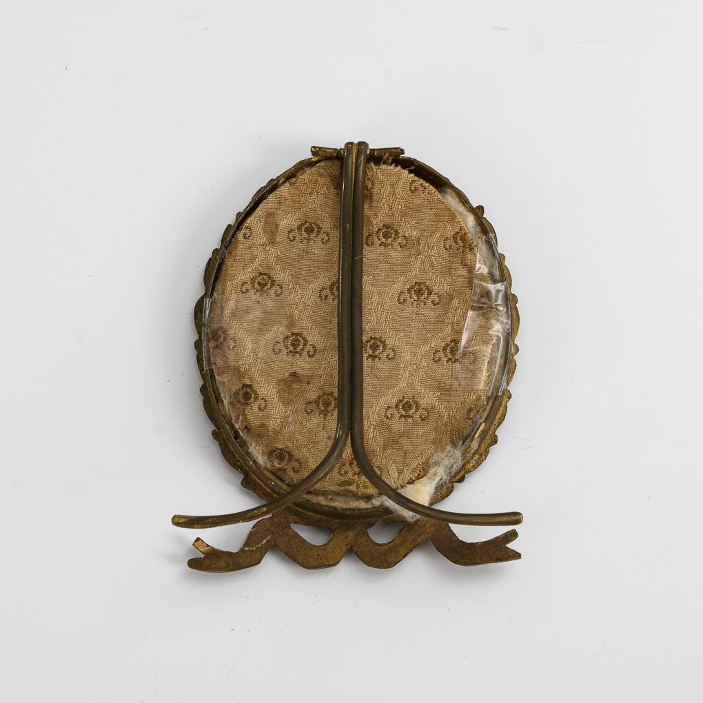 Polychrome painted, gold decorated. L 8,5 cm, in brass mounting frame (L 11,5 cm.