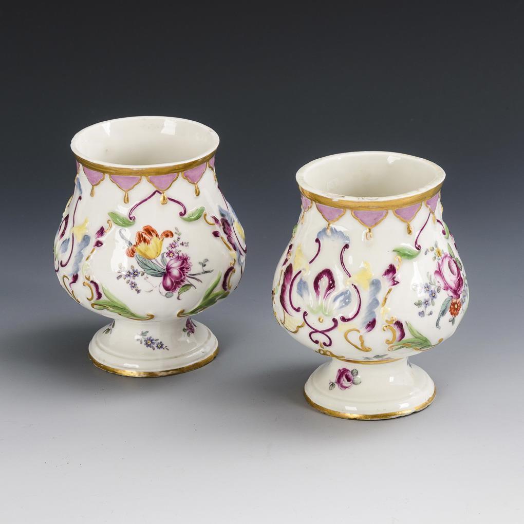 Baluster vessels with vegetal-ornamental relief, floral bouquets and scattered florets. 1x 2 bumpings at the foot, 1x 2 rim bumpings and rim crackle.
