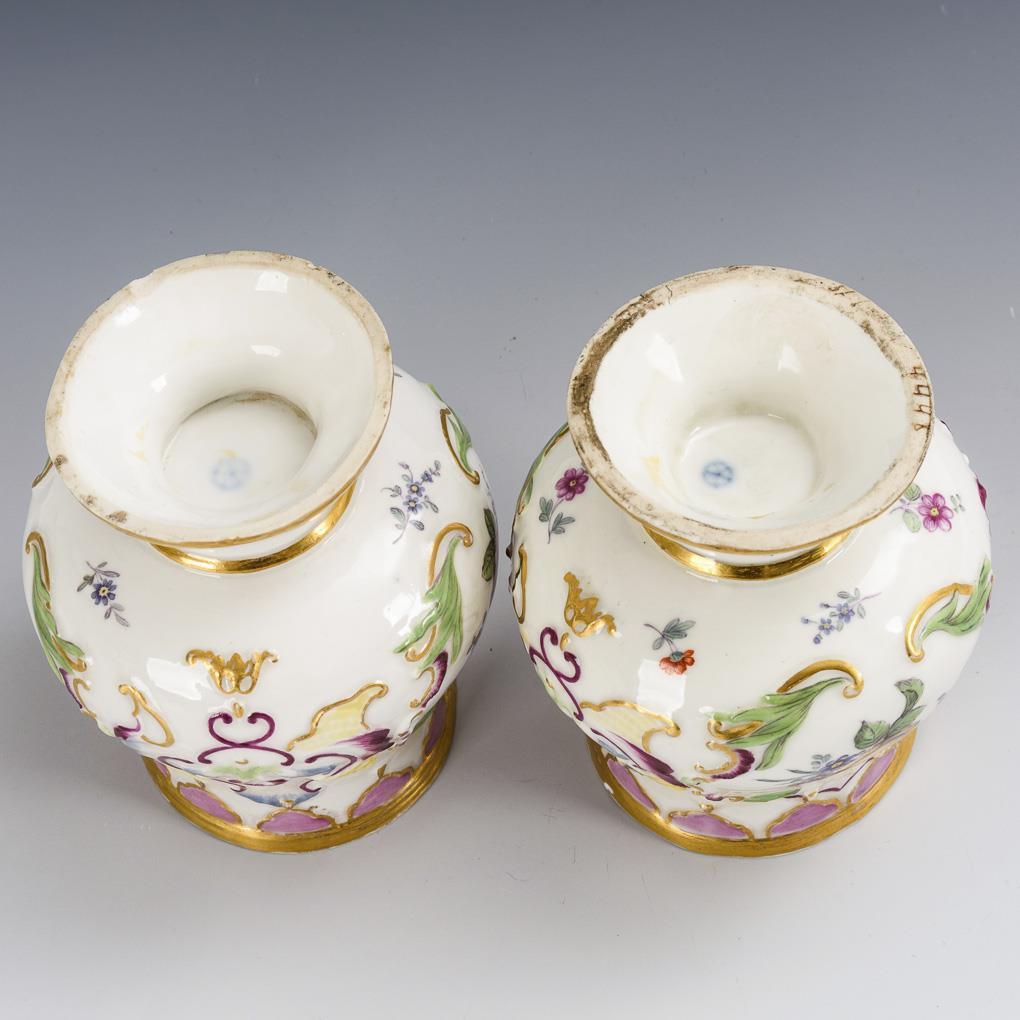 Baluster vessels with vegetal-ornamental relief, floral bouquets and scattered florets. 1x 2 bumpings at the foot, 1x 2 rim bumpings and rim crackle.