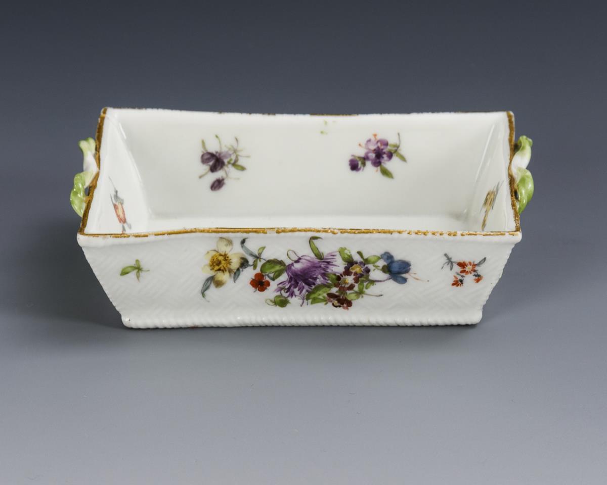 Rectangular bowl with basket relief and two branch handles. All sides small floral bouquets and scattered flowers. Gold somewhat rubbed.