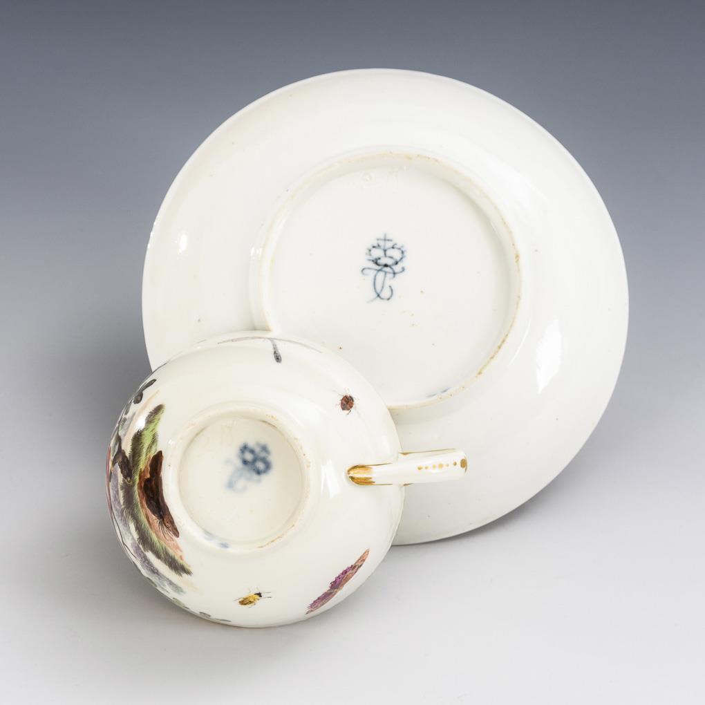 Polychrome painted, gold decorated. Cup (h 5 cm), saucer (Ø 14 cm).