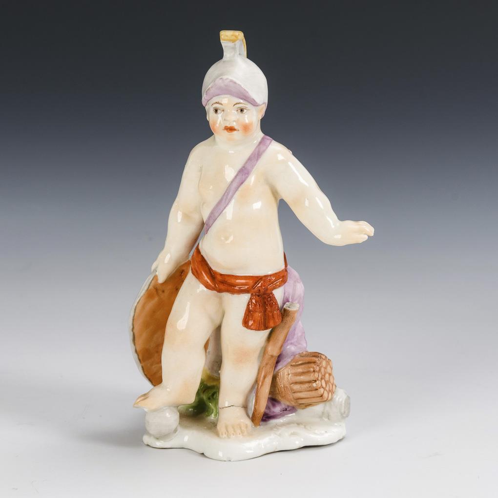 Cupid with round shield, helmet and bow, behind the Cupid a lion's head lying. Bumped at the edge of the base, left hand and right foot, bow defective, burn crack in the left foot.