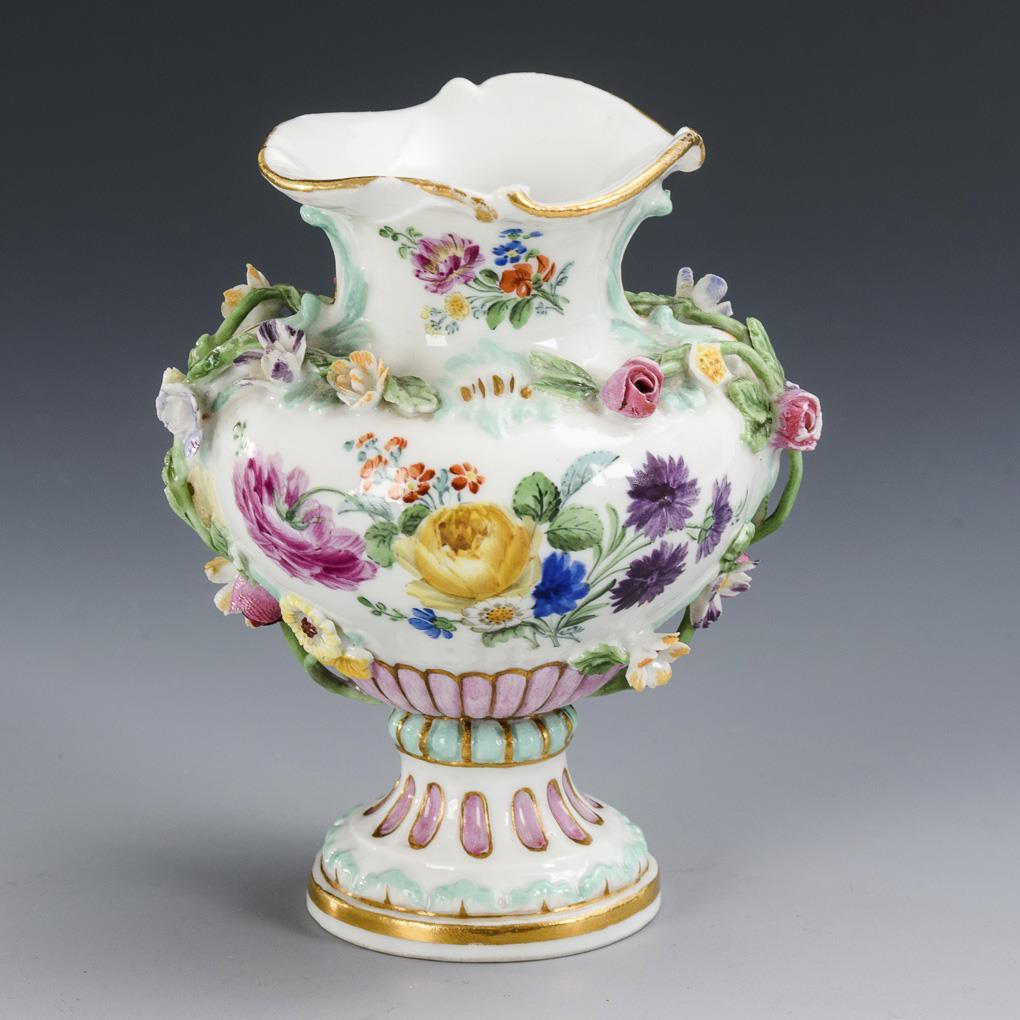Baluster vase with four-pass crater neck, topped with floral vines. On the front the depiction of a gallant scene, on the verso a bouquet of flowers. Bumps on the coating, 1 rim chip.