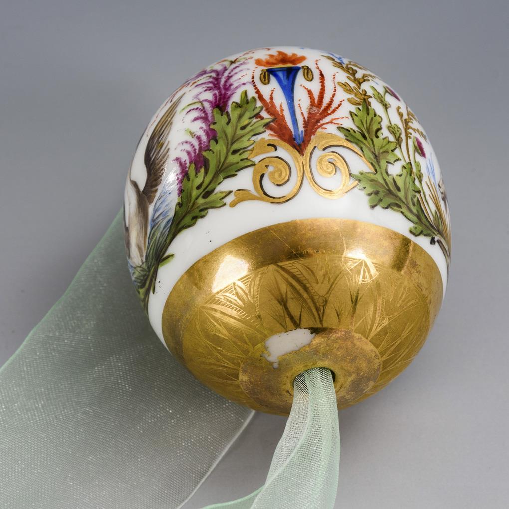 Between ornamentally engraved gold background the representation of a shawl-playing putto sitting on a billy goat and verso of a swan, each framed by leafy branches, flowers and torches. 1 small gold rubbing.