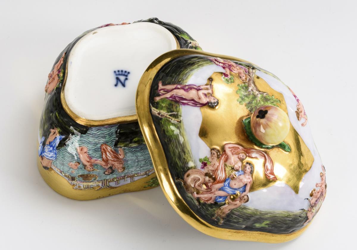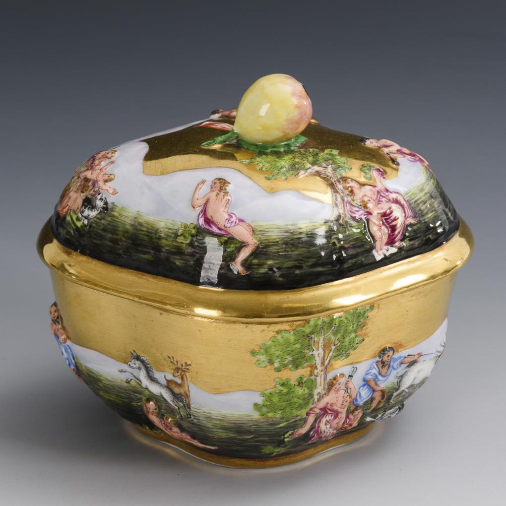 Four-pass box with fruit knob lid and a brightly colored painted bacchante relief on the wall and lid.