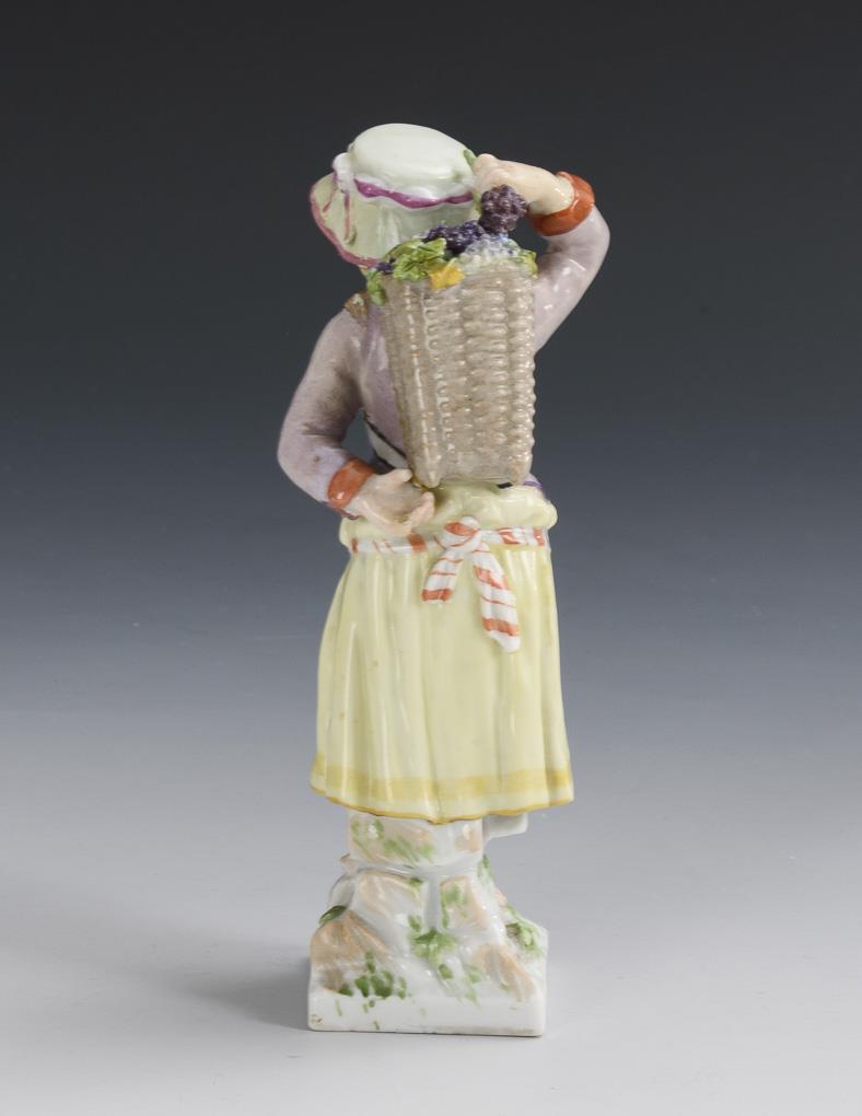 A grape-filled butte on the back carrying girl. Underneath chip on the stand, 1 finger bumped, hat and both shoulders restored.