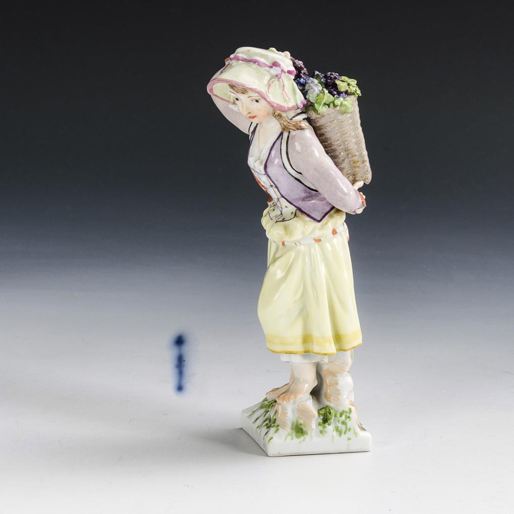 A grape-filled butte on the back carrying girl. Underneath chip on the stand, 1 finger bumped, hat and both shoulders restored.