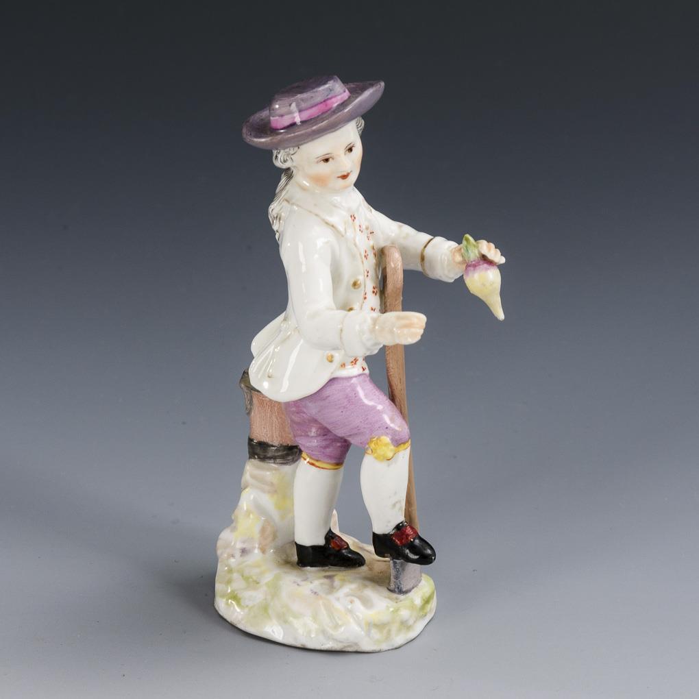 Boy with spade and turnip. Spade handle, hat brim and right leg restored.