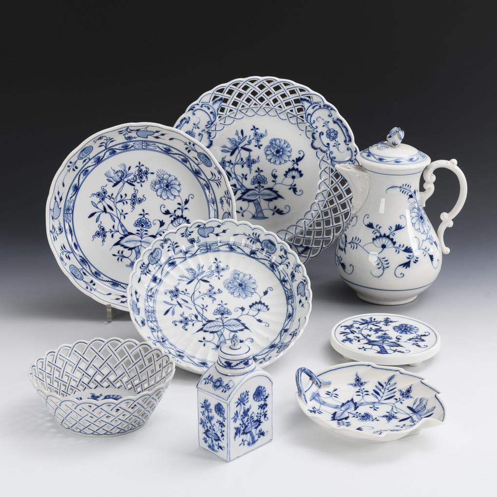 Form "New Cutout". Coffee pot (h 25 cm), tea caddy, leaf bowl, conical basket, coaster, fan bowl (Ø 23.5 cm), round bowl (Ø 26 cm) and breakthrough plate (Ø 30 cm). Rose knob bumped.