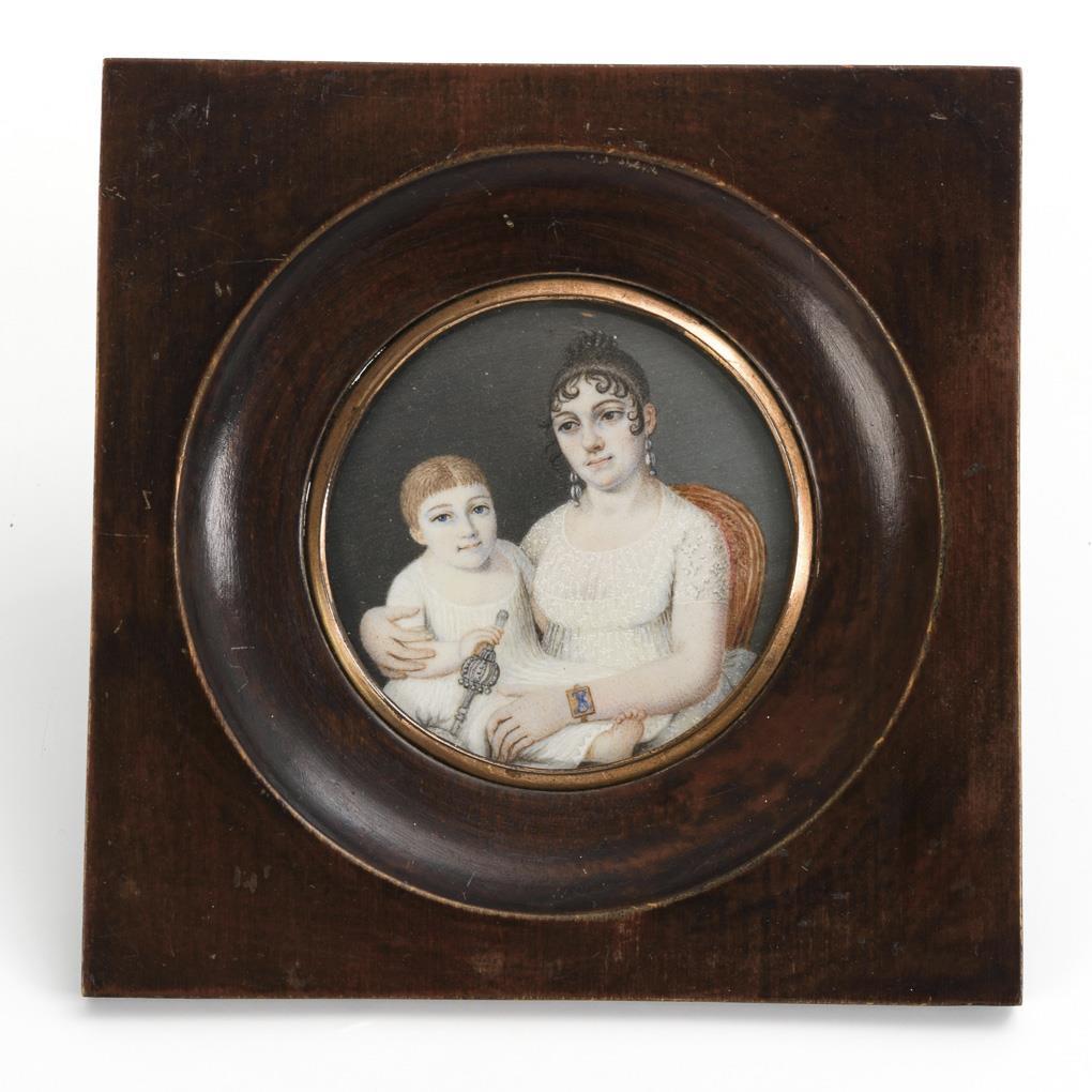 Sitting mother with child on her lap. The mother in a white dress wears a bracelet with the monogram "HS" and earrings; the child holds a rattle in his hand. Verso behind glazing painted monogram "HAS" on light blue silk.