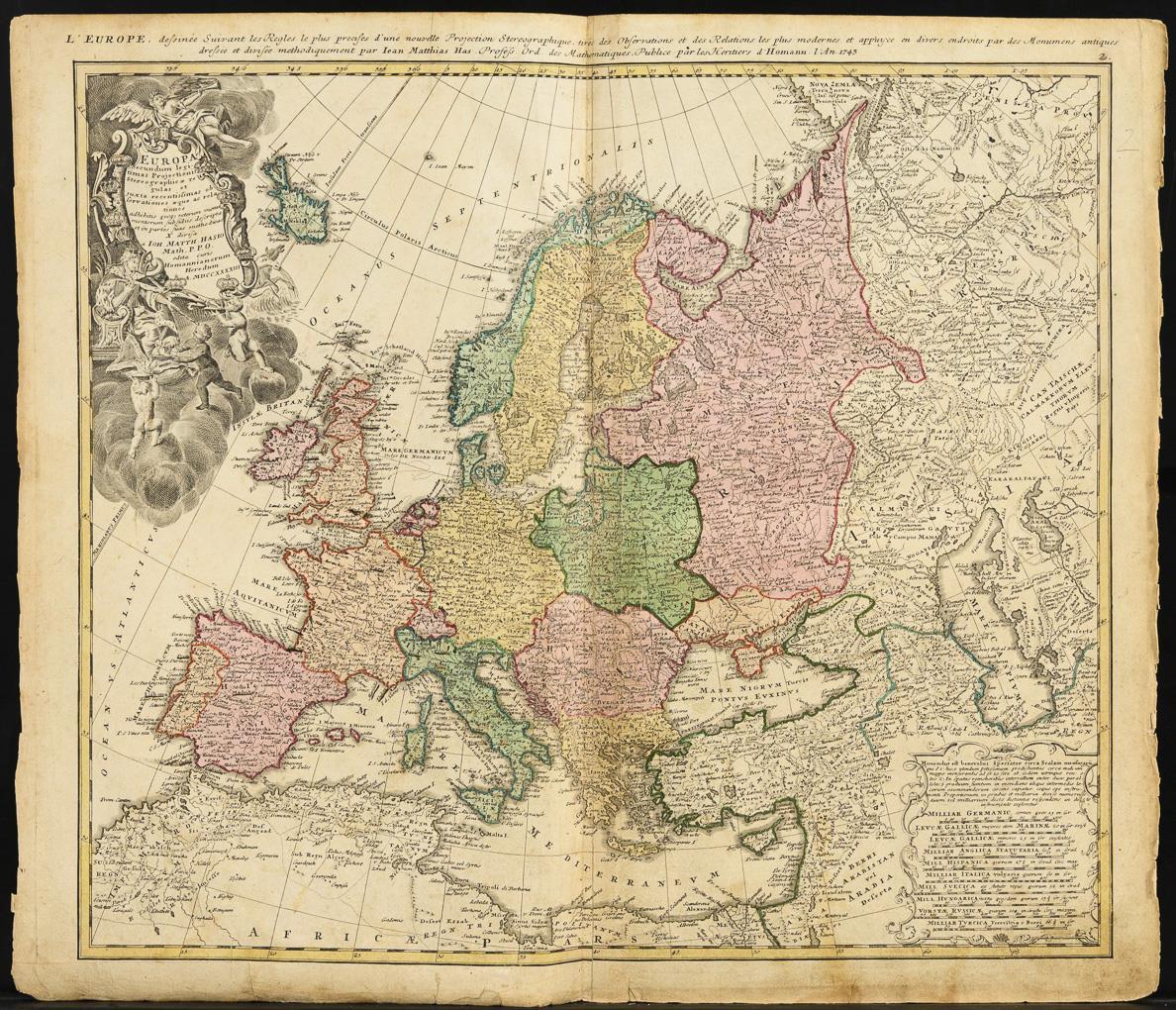 Detailed map of Europe, with allegorical title cartouche "Europa Secundum Legitimas Projectionis Stereographicae Regulas et Juxta Recentissimas Observationes Aeque ac Relationes [...]", mileage markers and title in French in the upper margin, with stereographic horizontal projection after Johann Matthias Hase (1684 - 1742), 1743. Sheet more grip-marked and foxed, back-taped centerfold, lower margin reinforced.