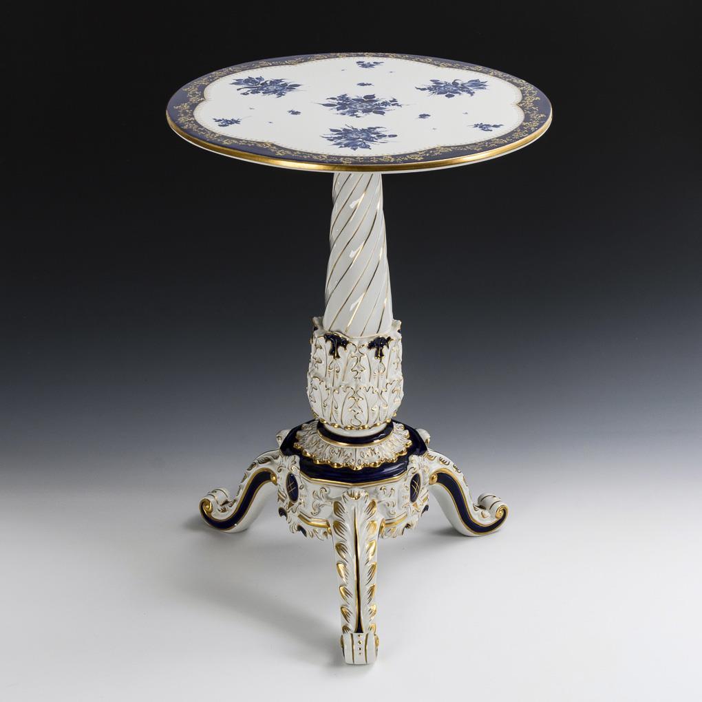 Round table top, curved fluted shaft with leaf relief wreath, octagonal foot with three legs.