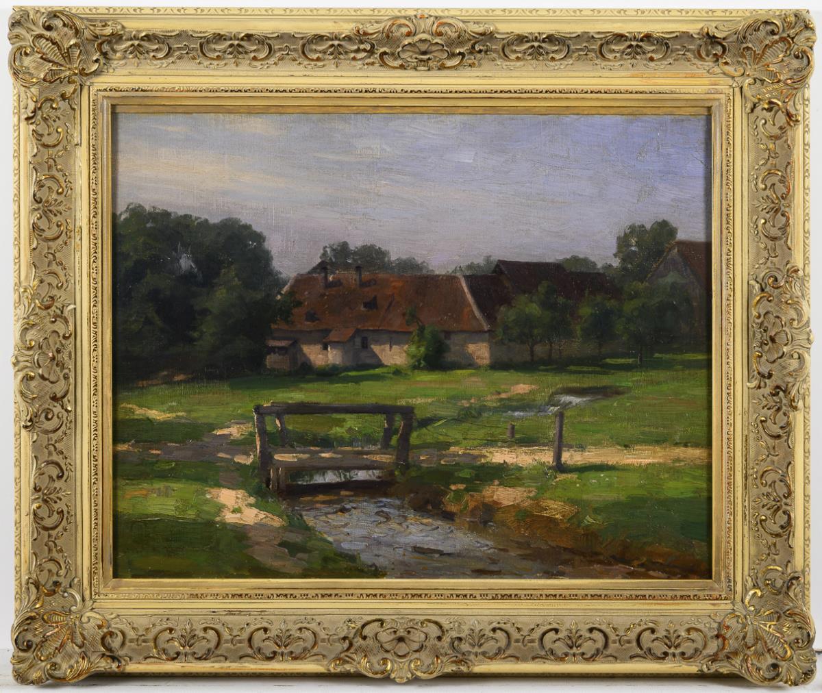Creek with small bridge in front of large homestead in the sunshine. Minimal signs of age.