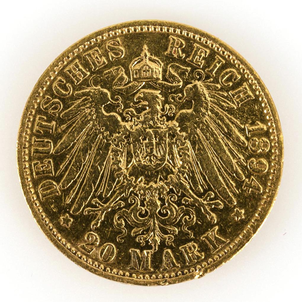 "Wilhelm II Deutscher Kaiser Koenig v. Preussen", 1894, Münzstätte A. Condition: very fine, small marginal flaws.
