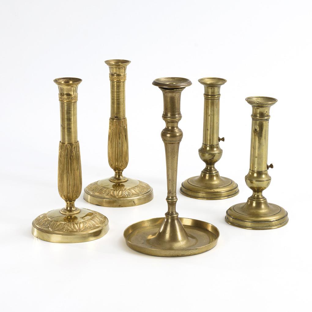 1 pair of bronze candelabra with leaf relief, 1 almost identical pair of sliding candelabra. 1 chandelier with bowl base and very slender baluster stem. Reliefed chandeliers with subsequently partially turned shafts and barely visible, soldered hairline cracks at the foot edge. Sliding chandelier with some dents and drilled holes at the foot edge from removed subsequent electrification. Slender chandelier with small crack at spout.