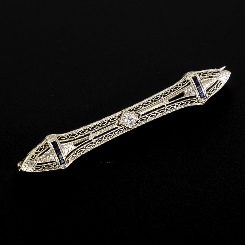 Brooch with brilliant-cut diamond and small sapphire bars set into the side. Ball hook. 1 sapphire bar cracked....