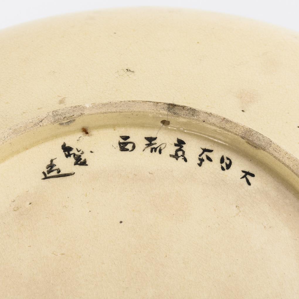 Round plate with floral slip painting. Without suspension (at the holes partially slightly fire cracked), traces of age, slightly gold rubbed.