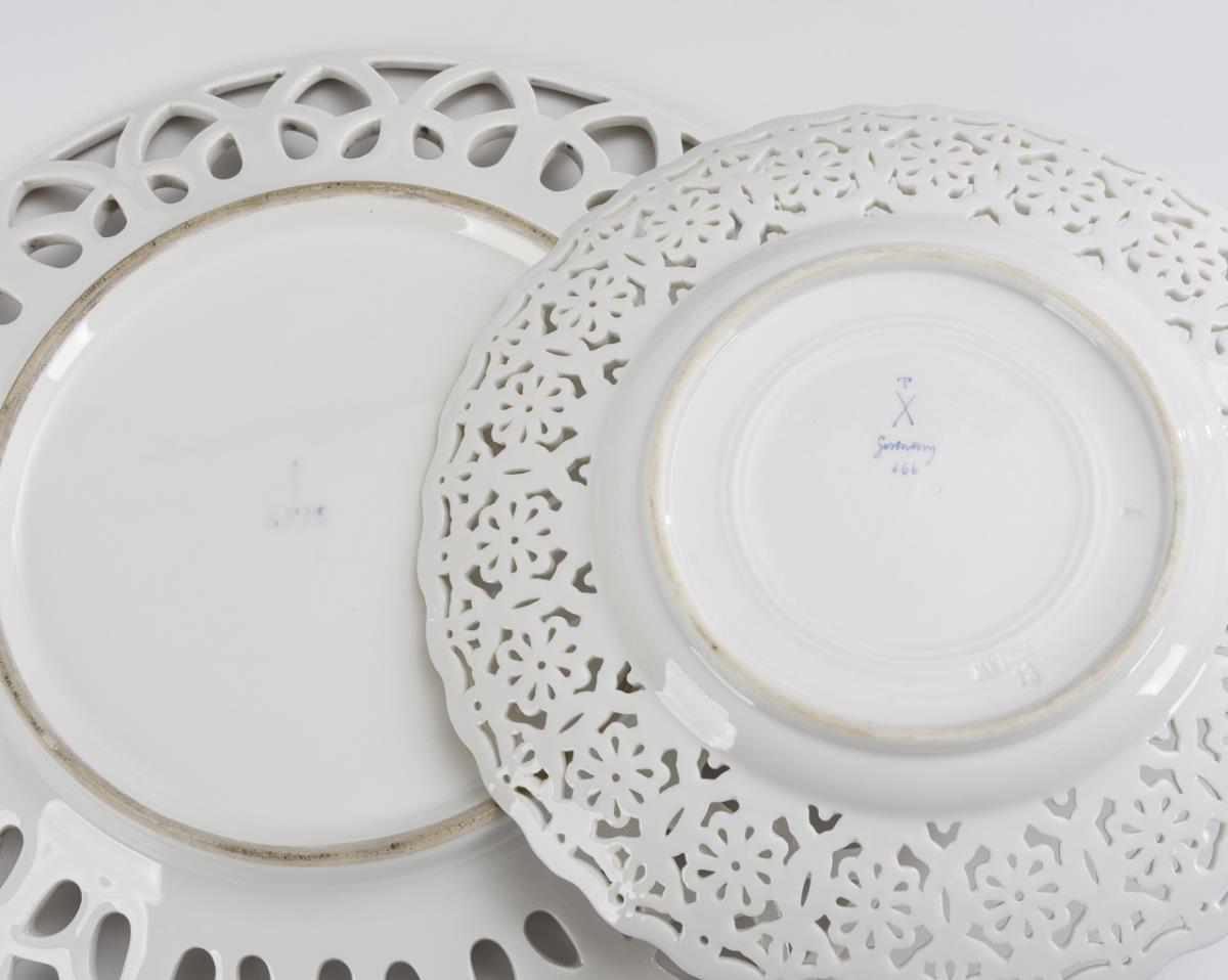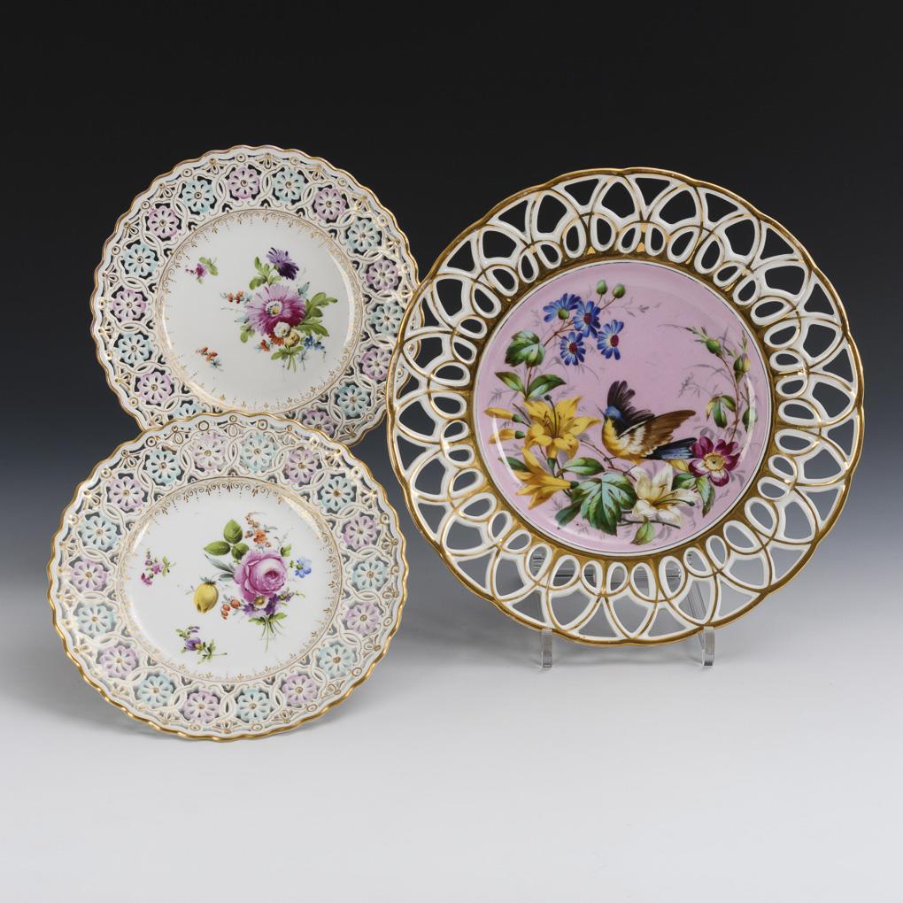 1x KRISTER, Waldenburg: credenza plate with arched flag and bird painting in the mirror (Ø 30,5 cm). / 2x embossed mark "Meissen" for Teichert and onglaze blue mark CARL THIEME: 2 plates with floral openwork flag and floral painting in the mirror (Ø 22.5 cm). 1x gold rubbed.