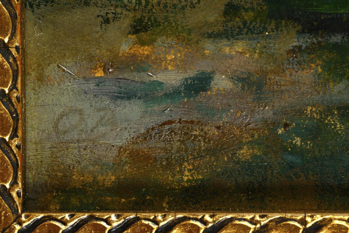Oil/painted cardboard. Faintly monogrammed lower left.