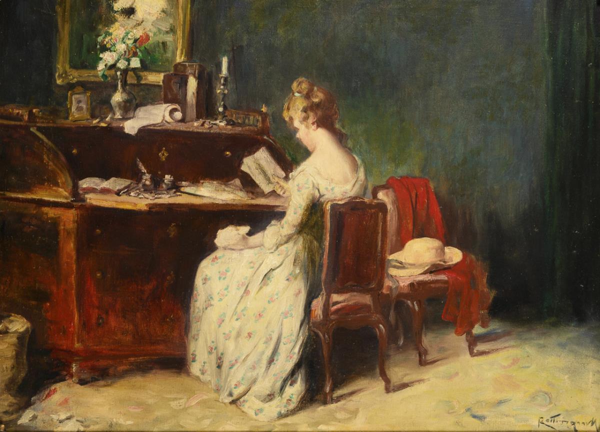 Young woman in blued dress reading a letter at a secretary. Minimal signs of age.
