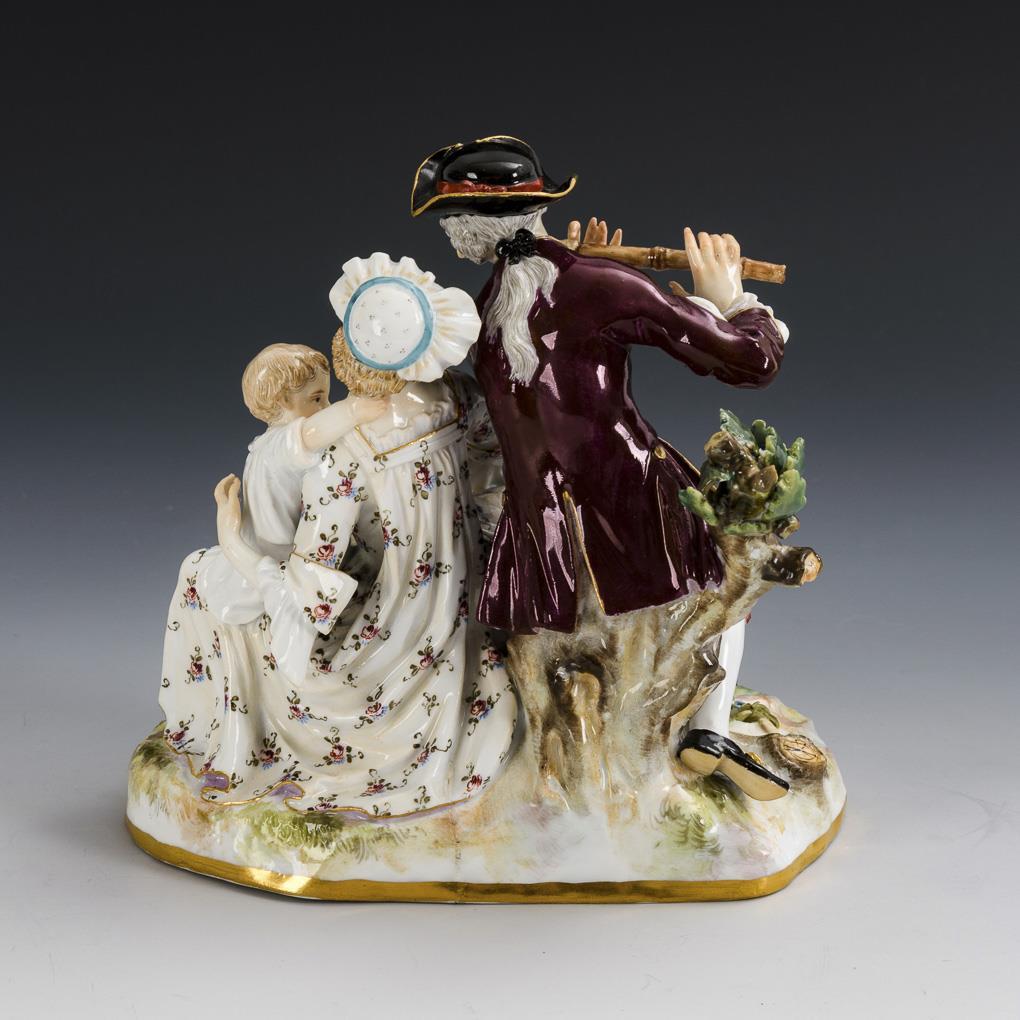 Sitting rococo lady nursing the child, holding the sheet of music to her flute-playing husband. Oak leaves, sheet of music, flute, both hands of the man and hat bow restored.