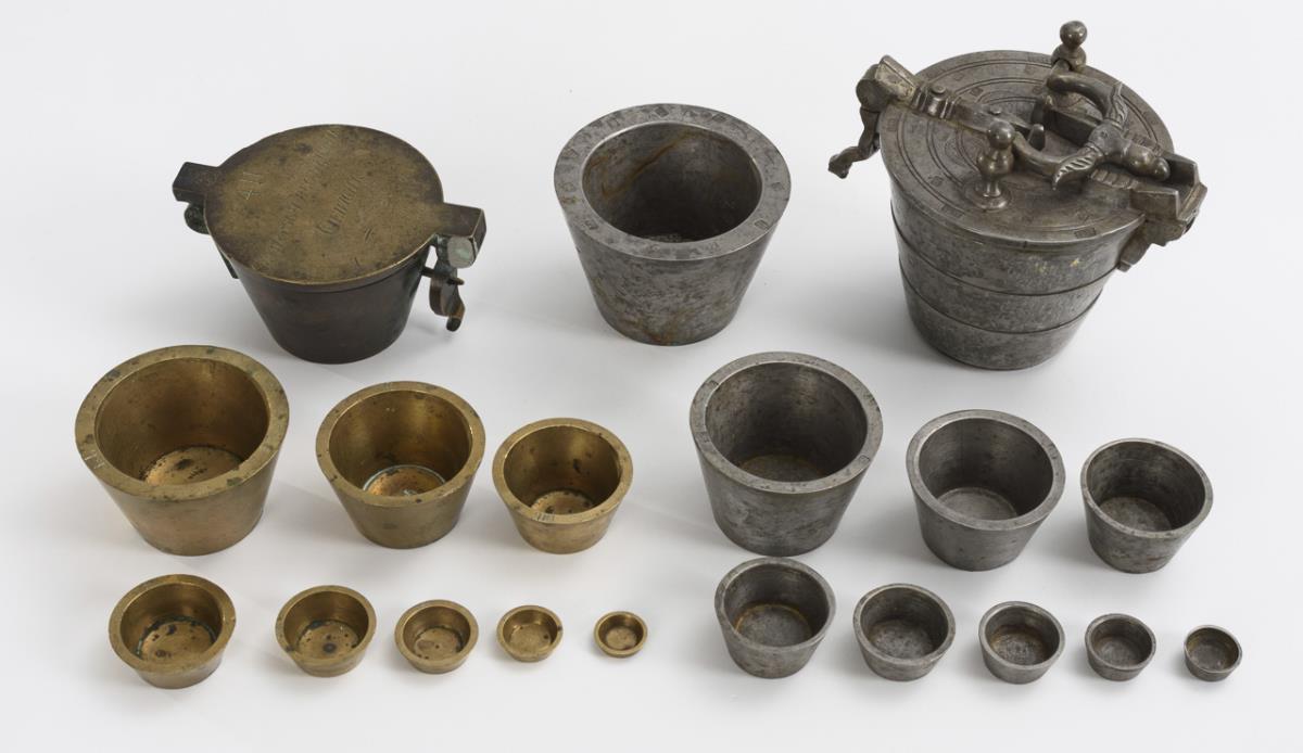 Bronze weight with smooth wall and smooth hinged lid, here engraved "4 pounds Gothaisch Rectificirtes Gewicht". On the top edges of the 8 existing "Bechergewichte" engraved designations from 1 quint to 1 pound, in the lid 2 pounds. / Newer pewter weight with indistinct hallmarks on the lid as well as numerous, mostly double year hallmarks; these partly also on the top edges of the 9 existing "Bechergewichte". Bronze somewhat bumped and partly green tarnished, 1 small paint spot on the closure, button weight missing. / Pewter weight with signs of age / use, small weights missing.
