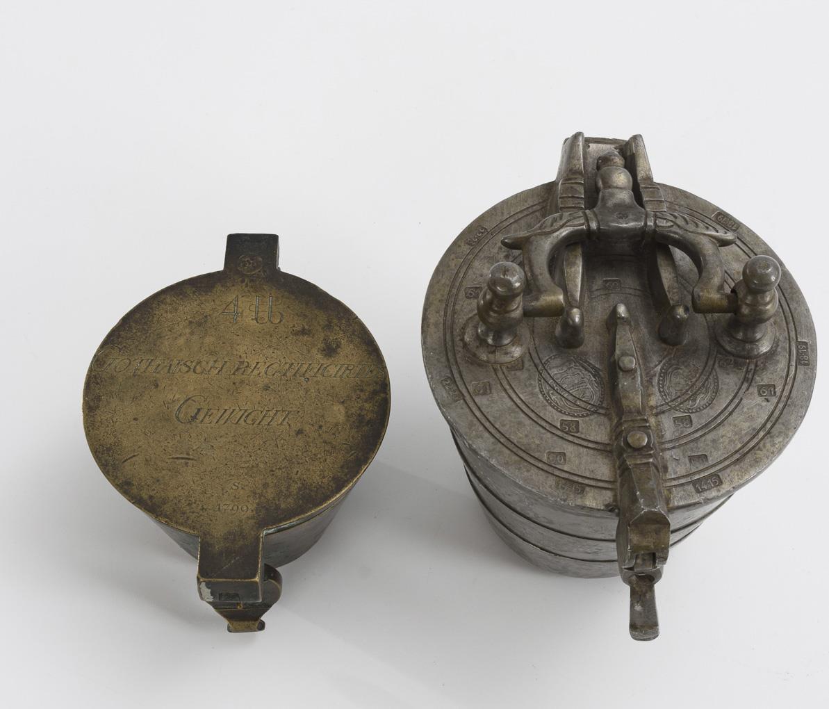 On the bronze weight engraved letter "S." with date "1799", pewter weight indistinctly punched. 1799 or 20th c.