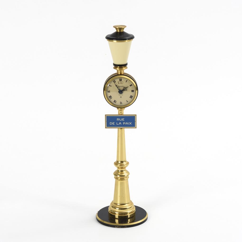 Table clock in the shape of a street lantern, inscribed on the blue street sign "Rue de la Paix". Minimal signs of age and use.