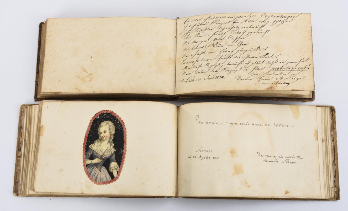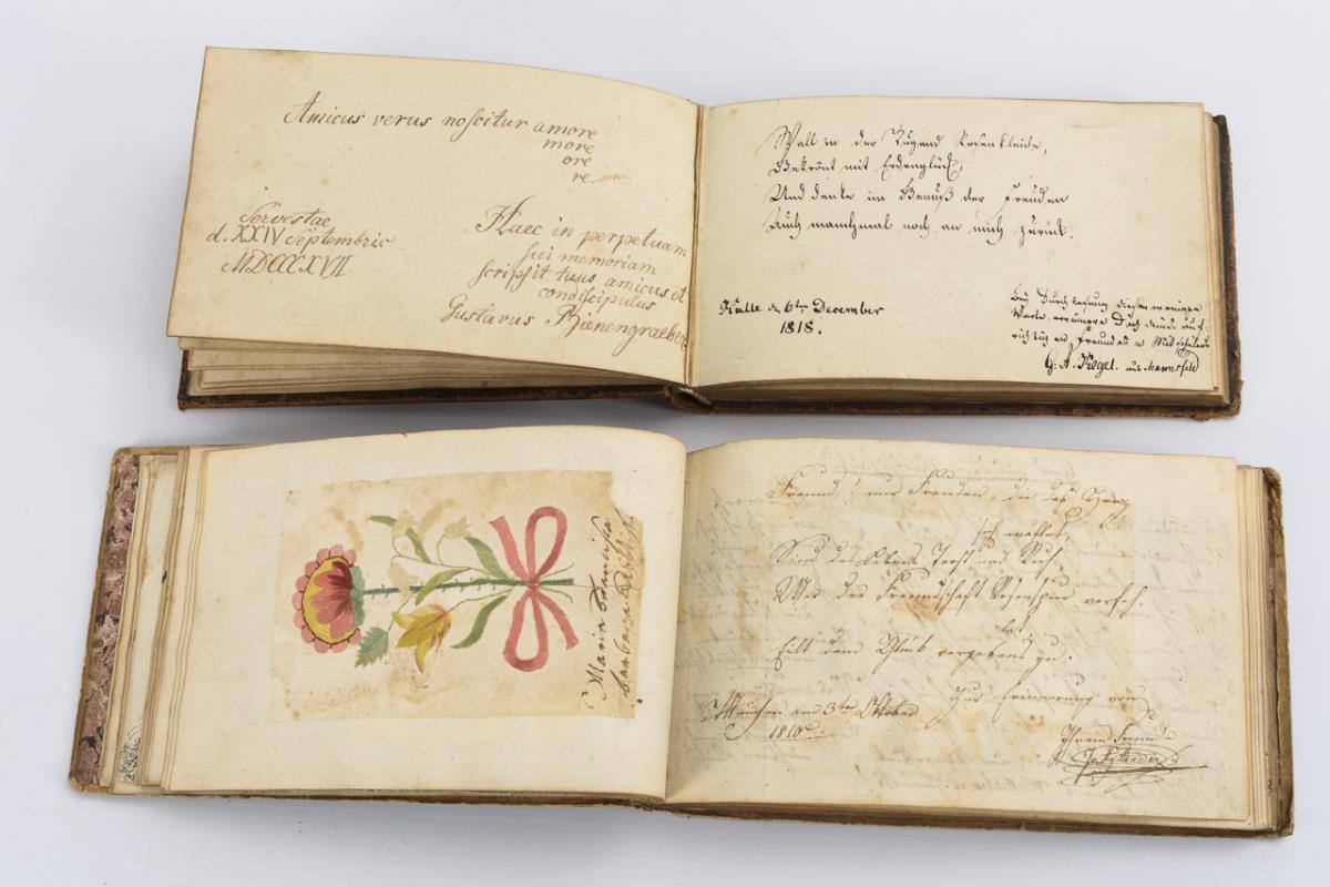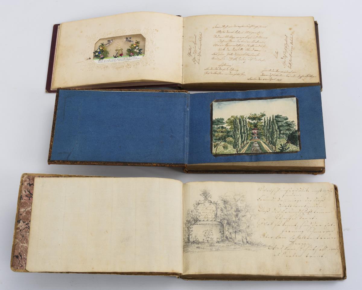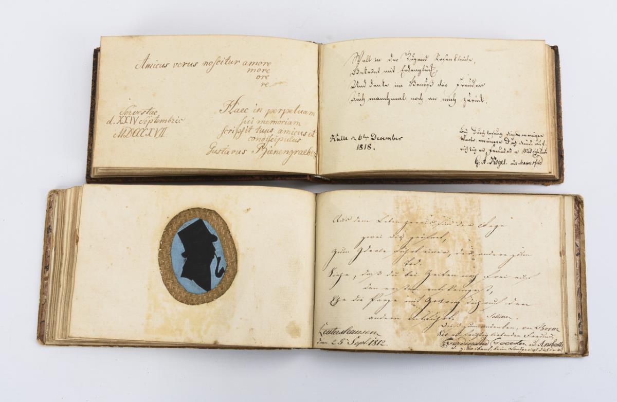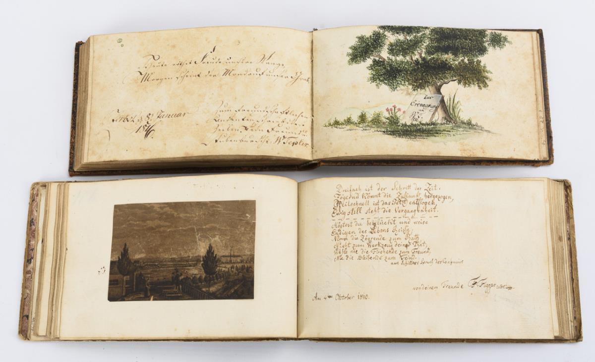 Early Liber Amicorum in leather binding, starting in 1815, with numerous, often Latin entries, mostly from Halle and Zerbst (including 1 pencil view of Zerbst, 1 ground plan watercolor from Zerbst, 1 exhibitable cut rose in watercolor, 1 landscape watercolor and 2 friendship stamps as well as 1 silhouette), numerous signatures on one page. 1 enclosed bookmark with painted Asian / In slipcase early album with brown cover, starting in 1810, mostly from München and Augsburg, also Nürnberg. Here 1 fine floral embroidery on paper, about 4 pencil drawings, 3 silhouettes (including from a flower watercolor, portraits partly loose enclosed), some mostly colored copperplate engravings and lithographs. 1 entry of "F. Fugger cadett" from 1810 with defective engraving of a city view / Red album with some entries, mostly from 1851, from Berlin. Here 1 multi-part präformed on gauze. Indents/Schatulle stärkere age/use traces, paper partly gebräunt, some cut out pages, 1 torn out place.