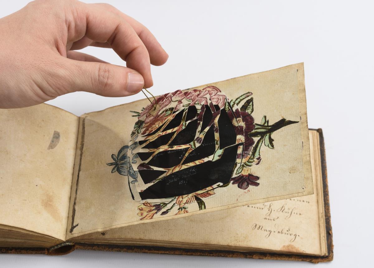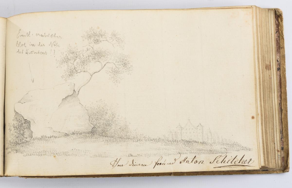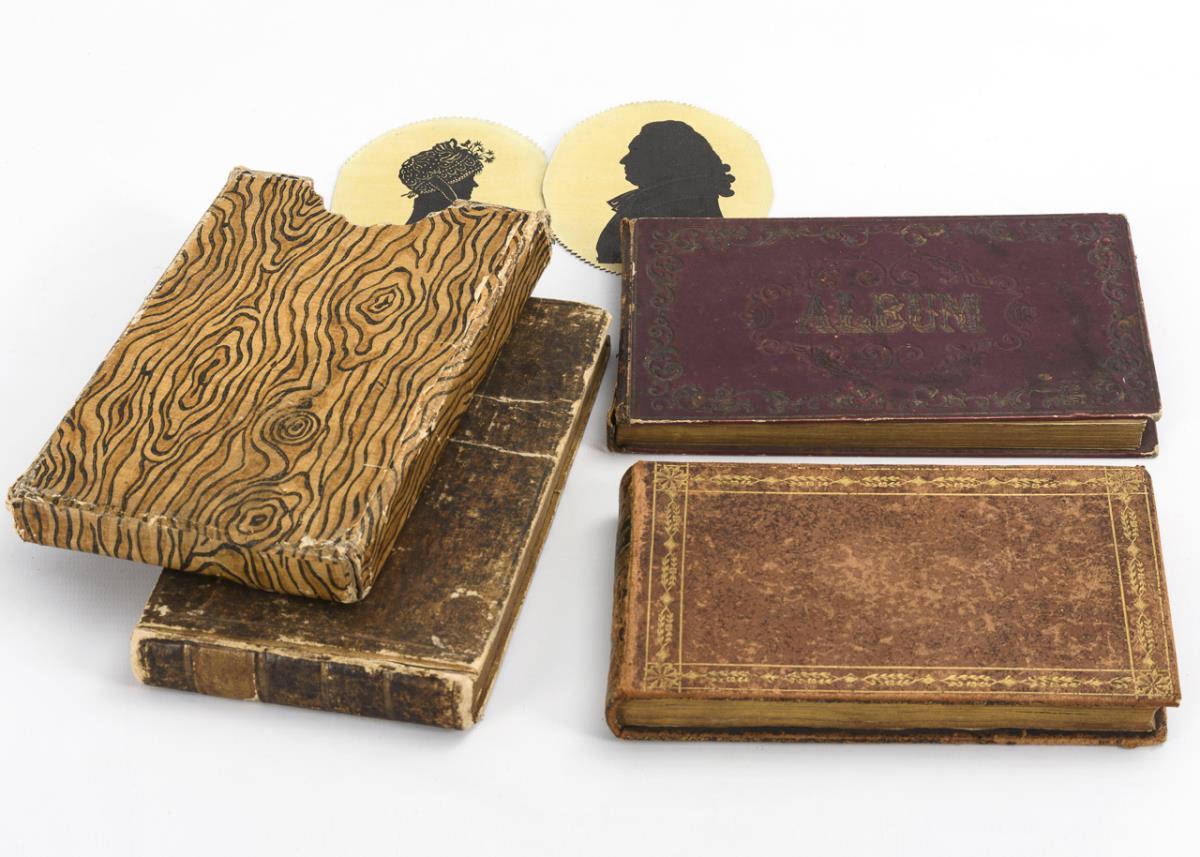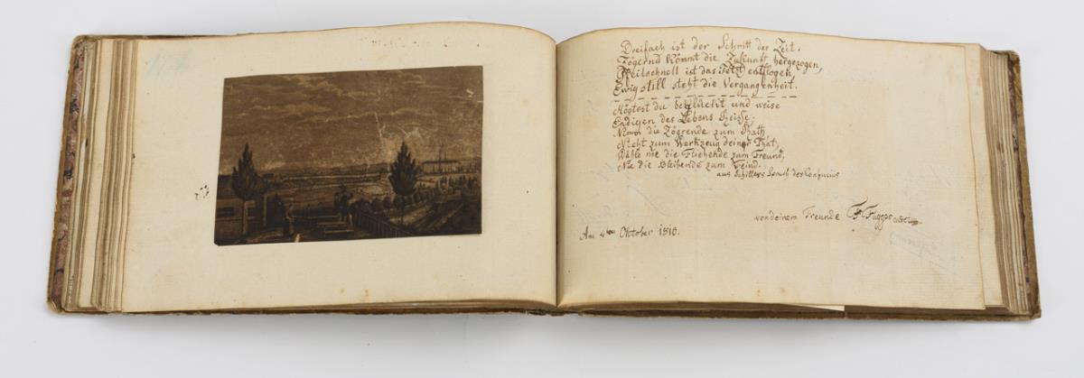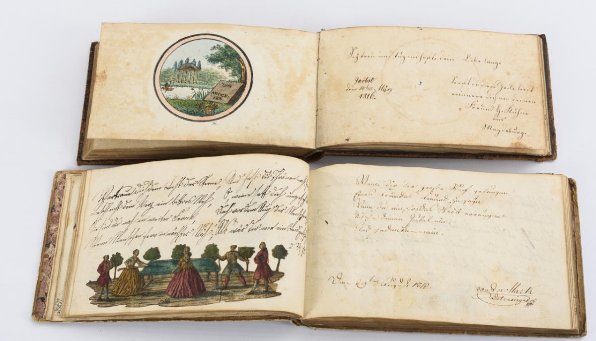 Early Liber Amicorum in leather binding, starting in 1815, with numerous, often Latin entries, mostly from Halle and Zerbst (including 1 pencil view of Zerbst, 1 ground plan watercolor from Zerbst, 1 exhibitable cut rose in watercolor, 1 landscape watercolor and 2 friendship stamps as well as 1 silhouette), numerous signatures on one page. 1 enclosed bookmark with painted Asian / In slipcase early album with brown cover, starting in 1810, mostly from München and Augsburg, also Nürnberg. Here 1 fine floral embroidery on paper, about 4 pencil drawings, 3 silhouettes (including from a flower watercolor, portraits partly loose enclosed), some mostly colored copperplate engravings and lithographs. 1 entry of "F. Fugger cadett" from 1810 with defective engraving of a city view / Red album with some entries, mostly from 1851, from Berlin. Here 1 multi-part präformed on gauze. Indents/Schatulle stärkere age/use traces, paper partly gebräunt, some cut out pages, 1 torn out place.