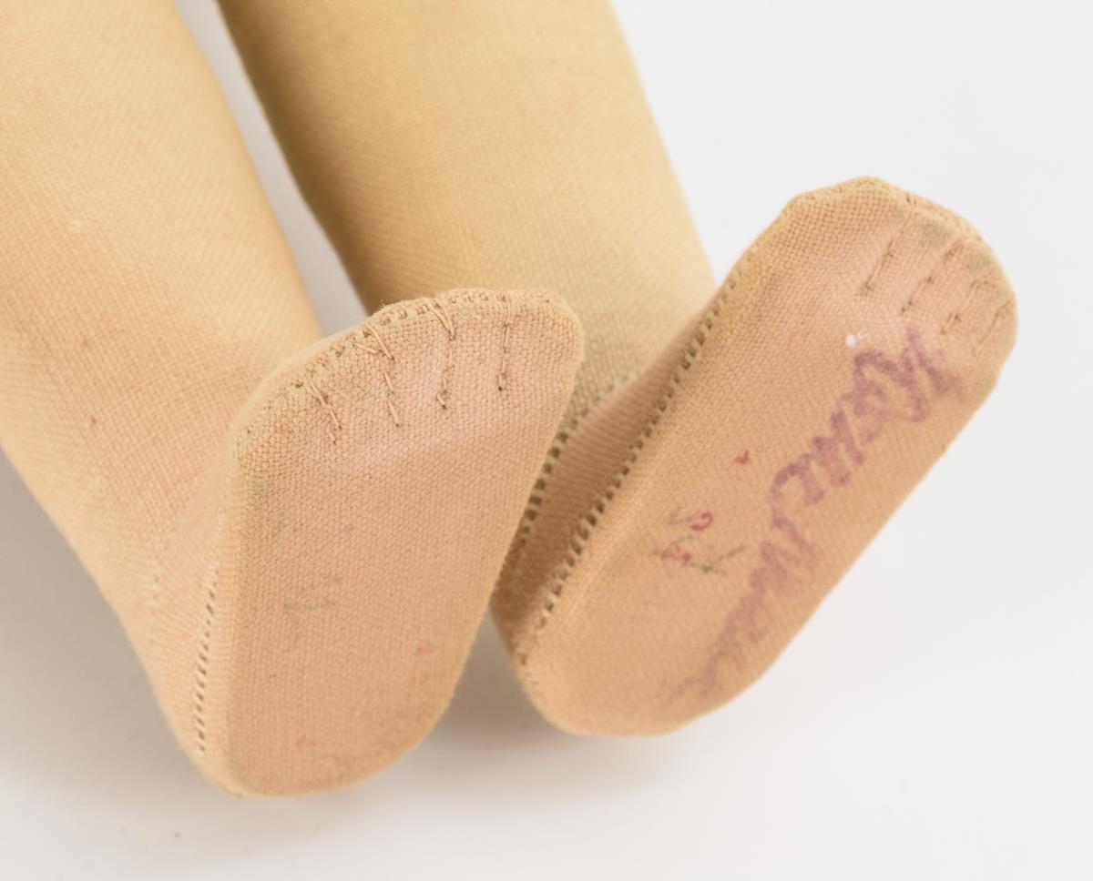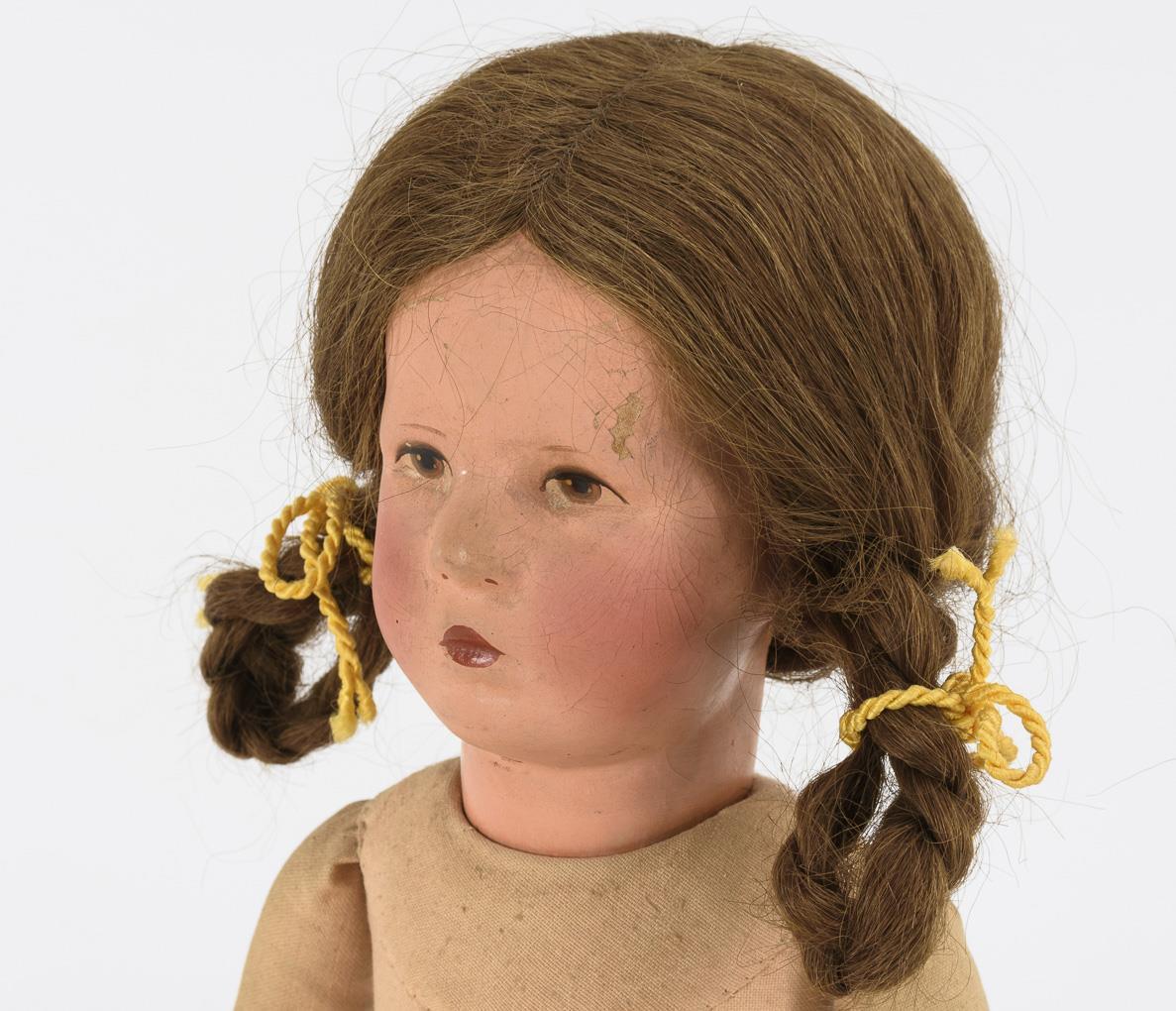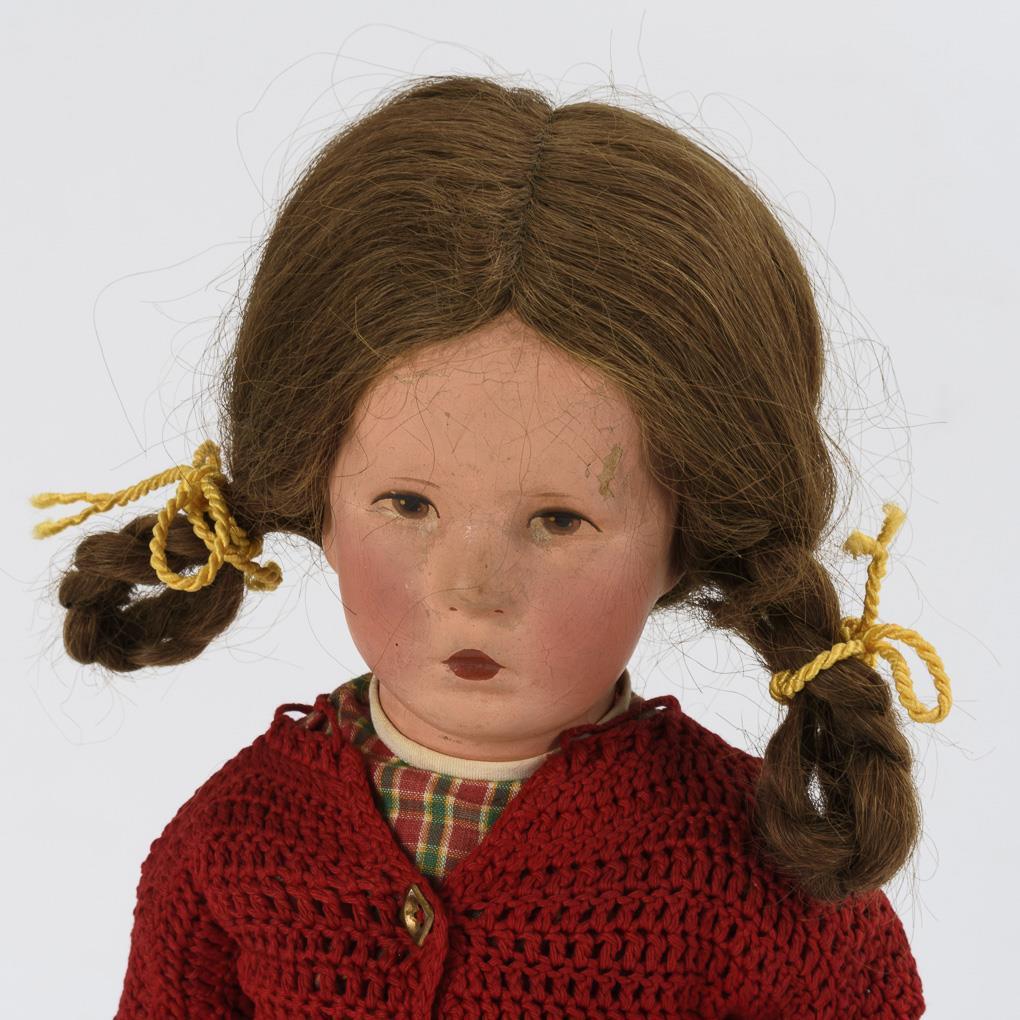 Crank head made of fabric, painted brown eyes, brown human hair wig. Slender body with flapping arms, legs with disc joints. Beige pants, red cardigan, light oilcloth shoes. Head with craquelure and color defects, legs slightly dirty.