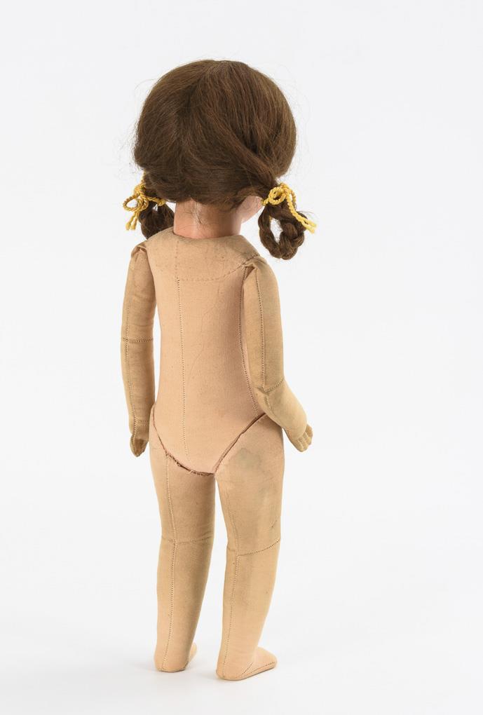 Crank head made of fabric, painted brown eyes, brown human hair wig. Slender body with flapping arms, legs with disc joints. Beige pants, red cardigan, light oilcloth shoes. Head with craquelure and color defects, legs slightly dirty.