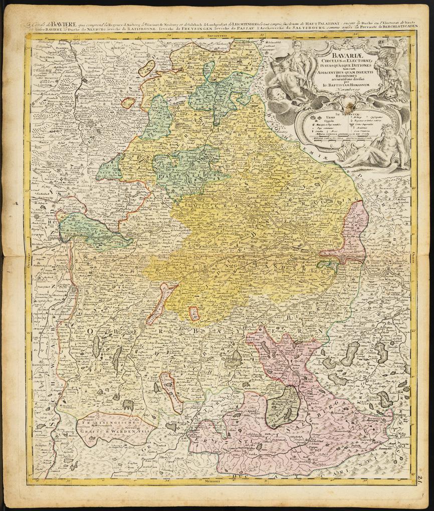 Detailed map of Lower Bavaria, Upper Bavaria and the Upper Palatinate, with heraldic title cartouche "Bavariae, Circulus et Electorat [...]", with title in French at the top margin, legend and mileage markers, ca. 1720. Sheet grip-marked and foxed, back-taped centerfold, marginal area browned.