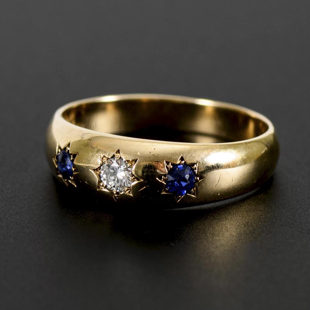 Band ring with diamond and sapphires.