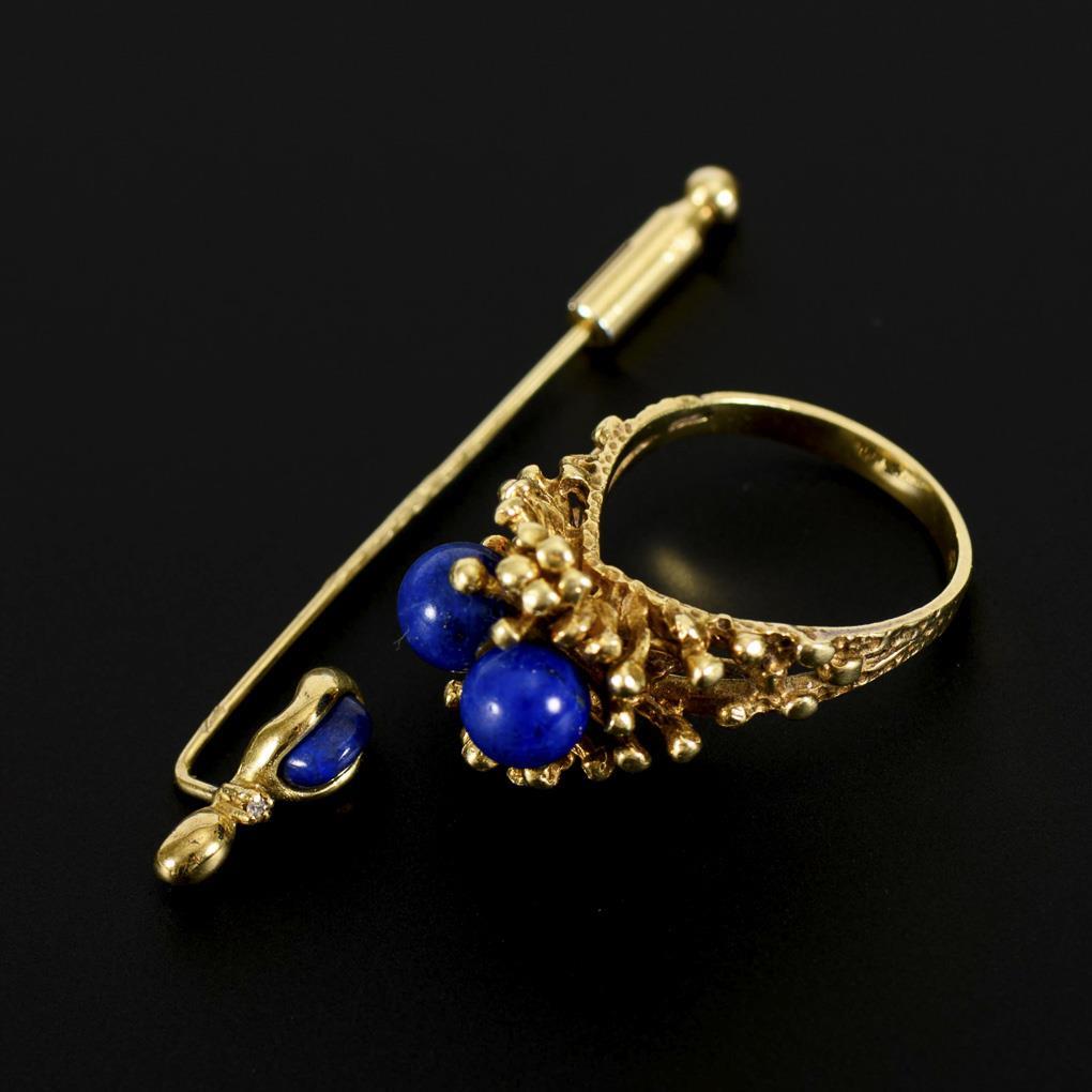 2 lapis spheres in free-form ring head between narrow rail. Pin head with lapisca bochon and micro diamond on pin with metal slider.