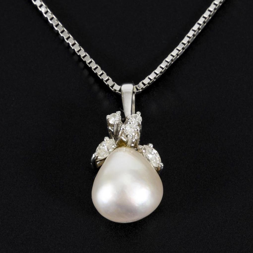 Pendant with cultured pearl, diamonds and diamonds, on chain.