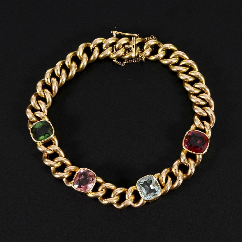 4 casket-set colored stones (tourmalines?, aquamarine?) between curb chain, on box lock with figure-eight safety and safety chain. Facet edges of stones rubbed.