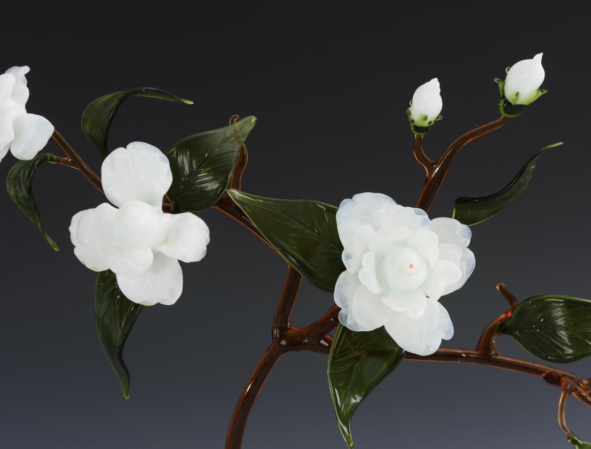 Glass object: camellia branch and four animals. Lauscha.
