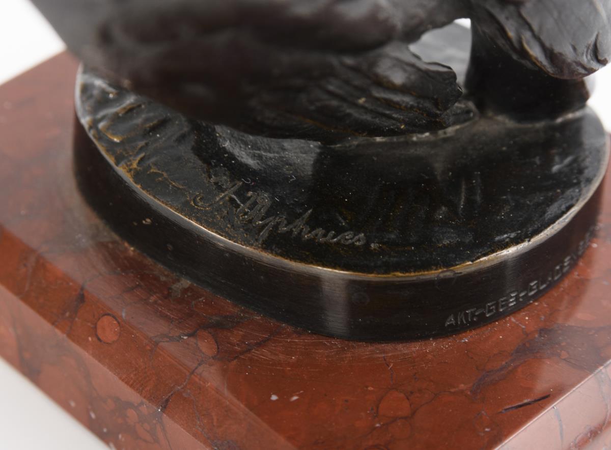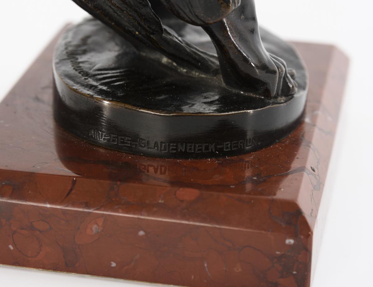 Bronze black-brown patinated, red marble plinth. Inscribed, casting mark "Akt.-Ges.-Gladenbeck-Berlin.". H 35 / 37 cm.