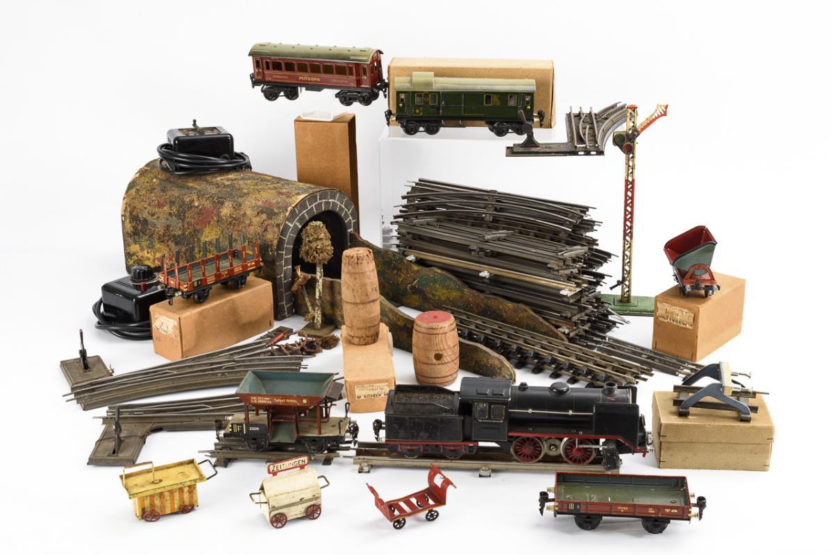 0 gauge. Black, defective locomotive for electric operation (L 23.5 cm) with tender, 1 red "Mitropa dining car 17520", 1 green freight car with sliding side doors, 1 stake car, 1 tipping car, 1 low side car and 1 ballast car "Talbot". Also included are 2 transformers (No. 270 A and No. 13474), 1 signal, 1 bumper, 3 turnouts, 1 tunnel, 1 bridge element, 1 tree, 2 wooden barrels, and approx. 40 tracks. For good measure 3 small Kibri cars (buffet car, newspaper car and baggage car) with defects. Function not tested. Transformers wired younger, signs of age, defects.