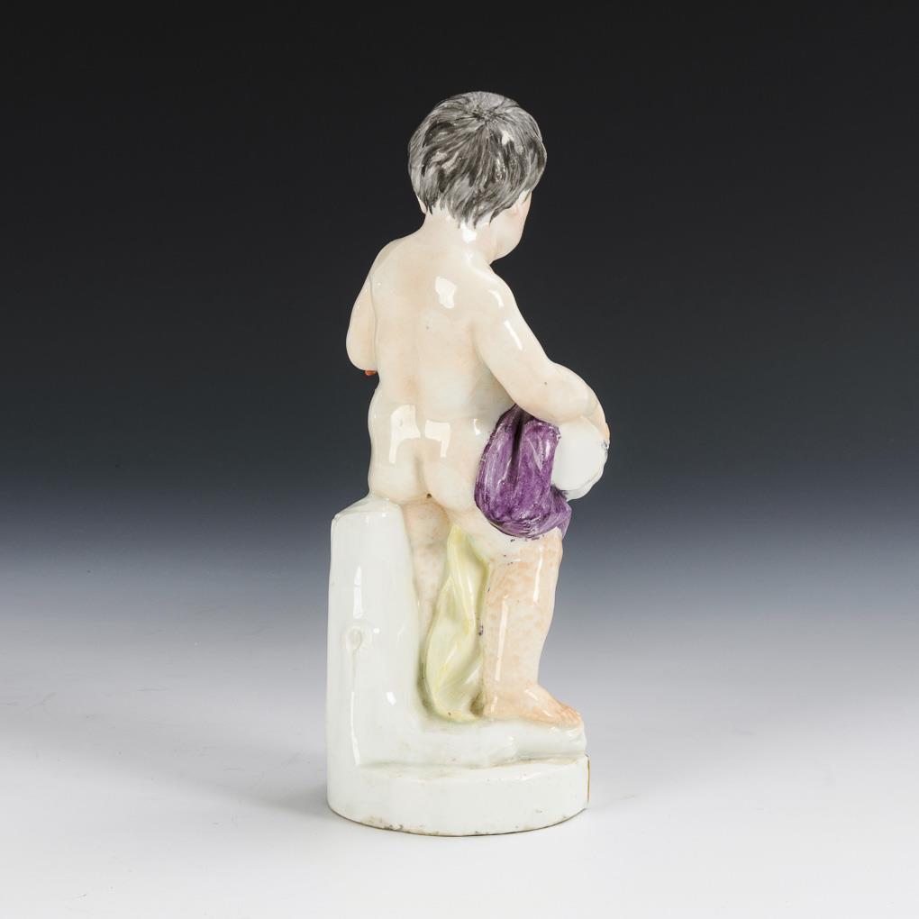 Standing cupid boy with fish, pouring water from a pitcher. Water jet and 1 finger bumped, chip on the stand and at the foot of the pitcher, fish tail minimally bumped.