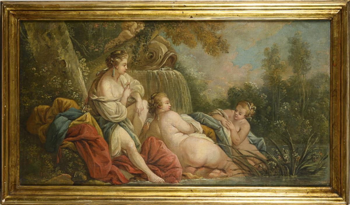 In the style of the Rococo painted three women in the sunshine on the shore of a water. Slight signs of age.
