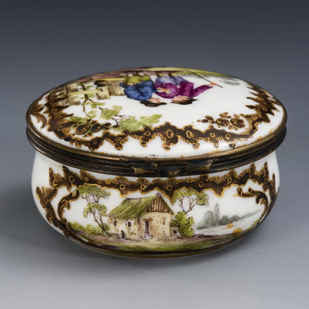 Round box with brass mounted hinged lid. On body and on and in the lid the depiction of landscape islands with peasants, partly in a brown-gold rocaille frame.