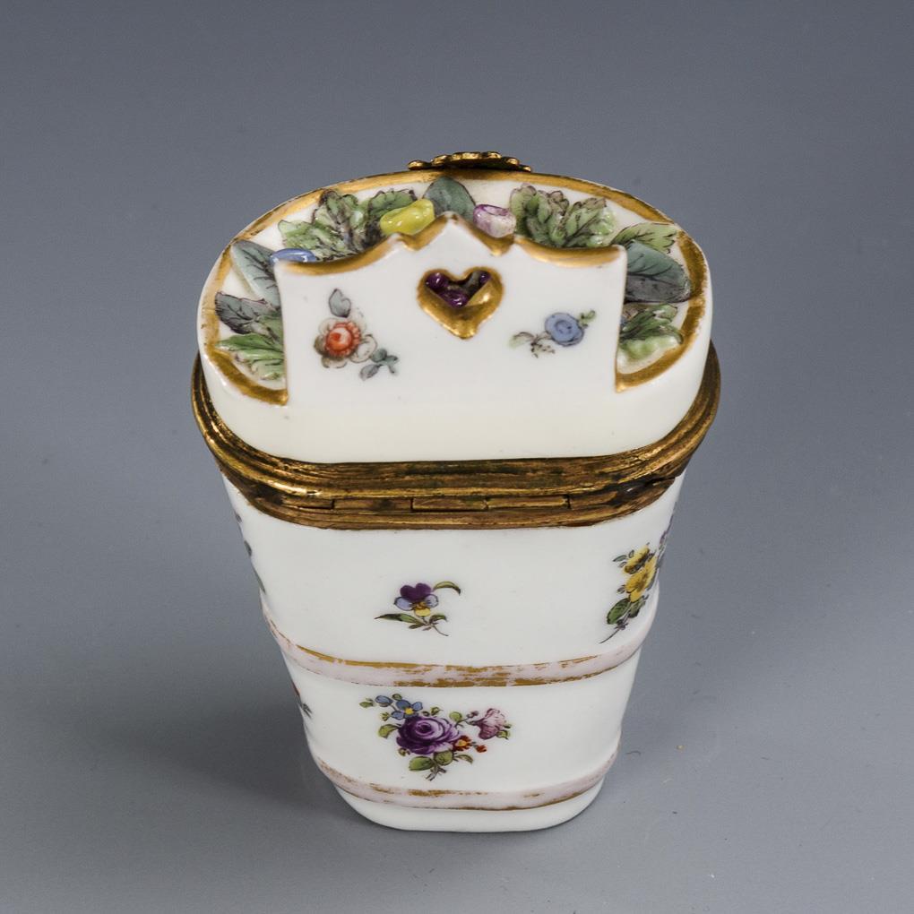 Tapered box with brass mounted hinged lid. Worked as a wine goblet with fruit and flower relief on the lid. The box served as a container for the lady's beauty patches. In the lid is therefore a small mirror, with which the correct placement of the pflästerchen could be controlled. Gold somewhat rubbed.