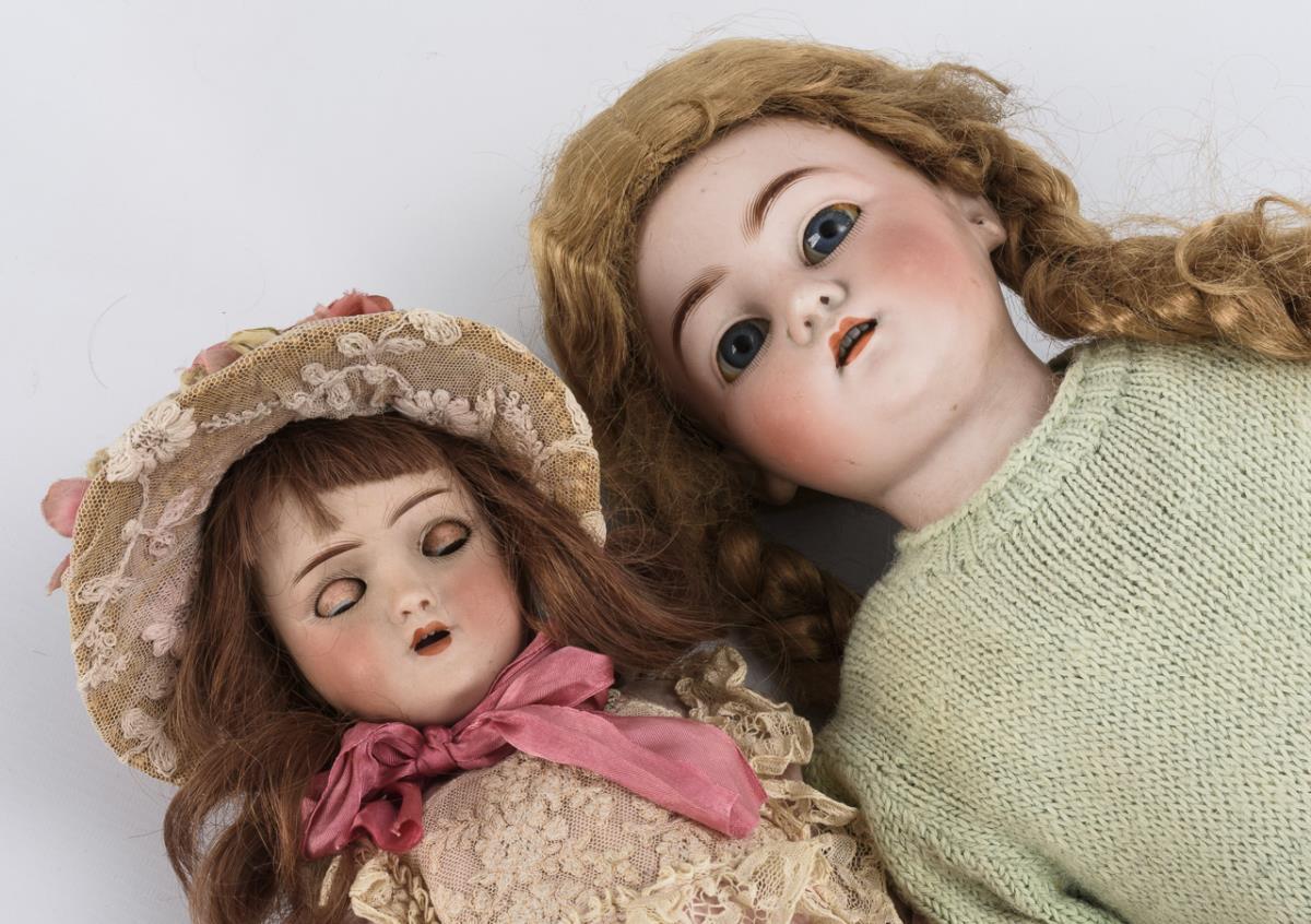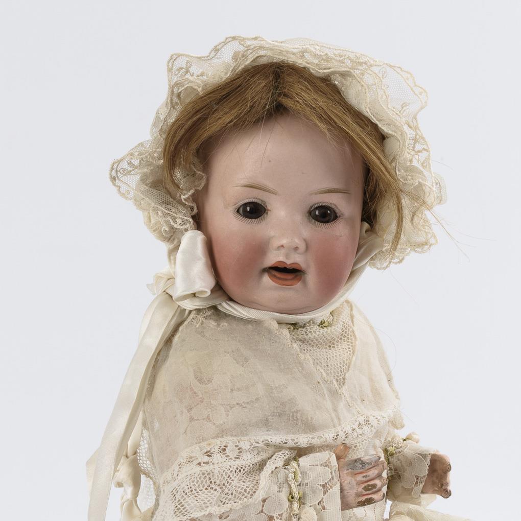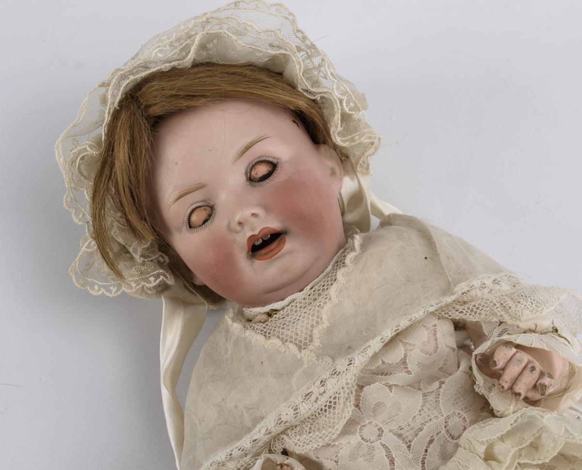 Large breasthead girl (Simon & Halbig, S & C 1180) with blue eyes, blond synthetic hair wig, leather body, celluloid arms and light green knitted dress (L 66 cm). / Small doll (Heinrich Handwerck, Simon & Halbig) with crank head, brown sleeping eyes, artificial hair wig, 15-piece jointed body, pink dress and straw hat (l 43 cm). / Character baby (Porzellanfabrik Mengersgereuth, PM 914) with crank head, brown sleeping eyes, defective real hair wig, 5-piece sitting baby body, white dress and hood (L 37 cm). Heads x-rayed: without defects. Body with small defects and overpaintings.