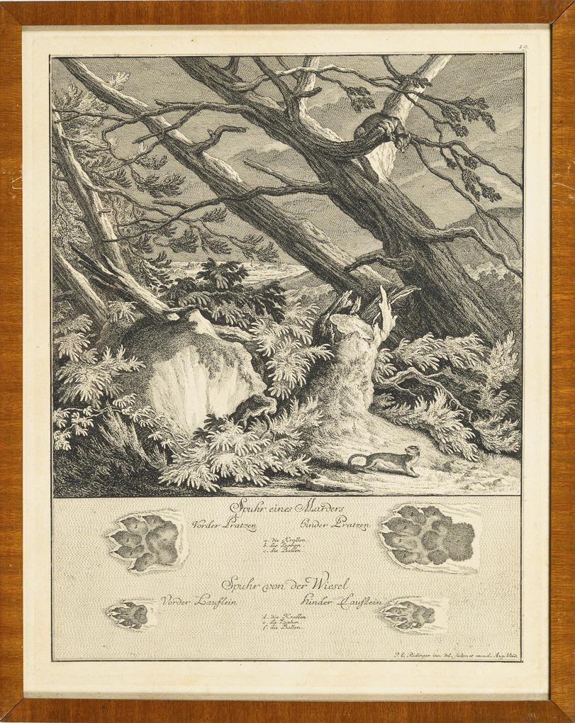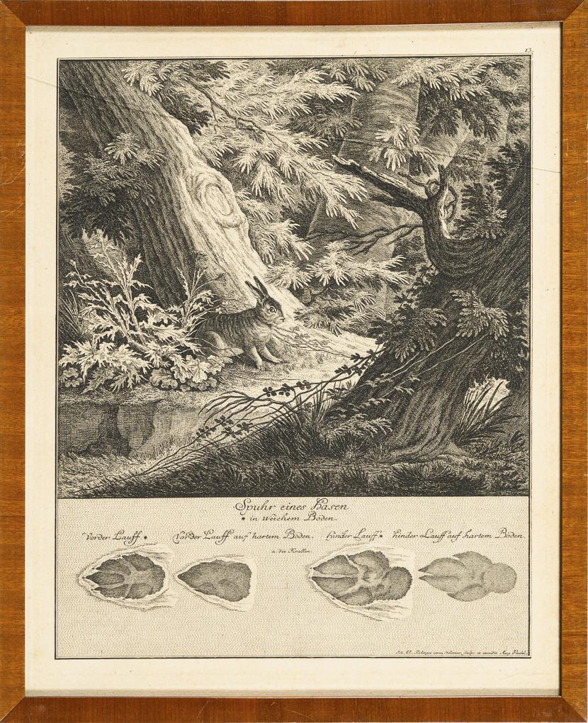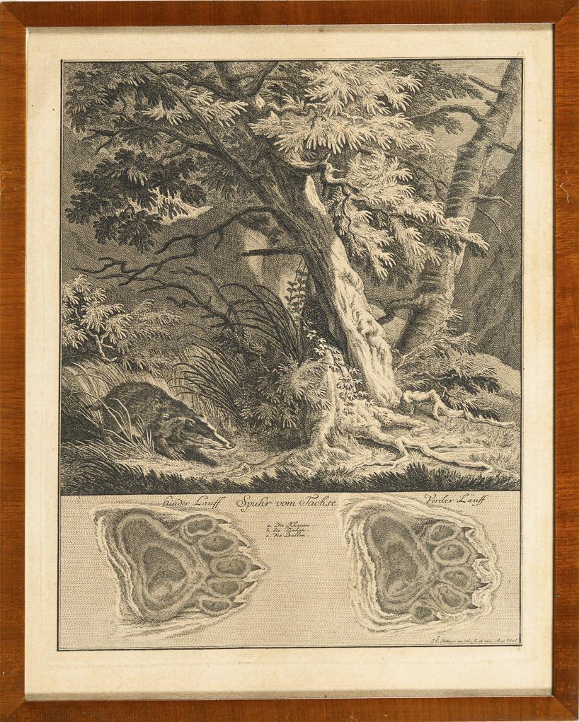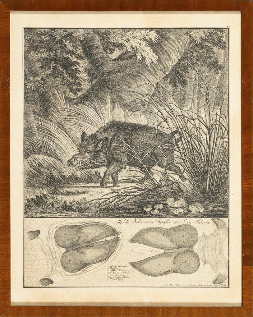 Characteristic representation of no. 168: wild boar, no. 169: fallow deer, no. 170: wolf, no. 171: roebuck, no. 175: hare, no. 177: beaver, no. 179: badger and no. 181: marten in natural surroundings, with illustration of the tracks, in Georg Thienemann's "Life and Work of the incomparable Thiermalers und Kupferstechers Johann Elias Ridinger [...]", 1856. 1 glass defective, sheet each grip-marked, partly light browned, partly trimmed.
